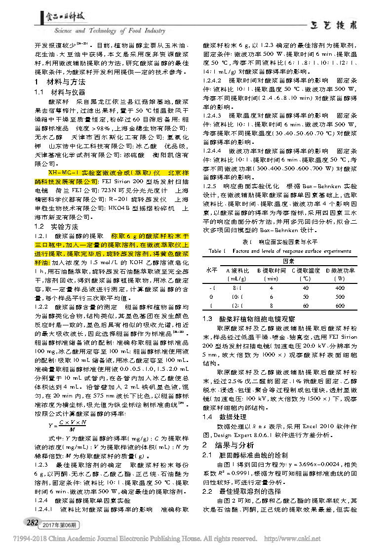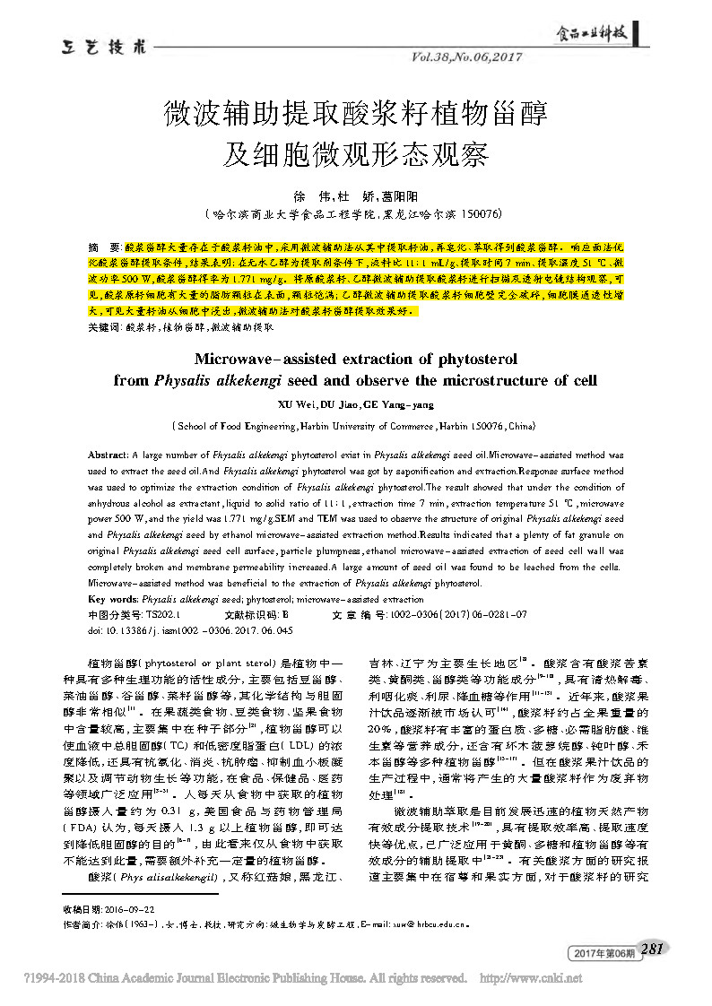 This paper was completed by a research scholar at the School of Food Engineering, Harbin University of Commerce. The paper discusses microwave-assisted extraction of phytosterol phytosterols and microscopic morphology of cells, and published in the important journal .