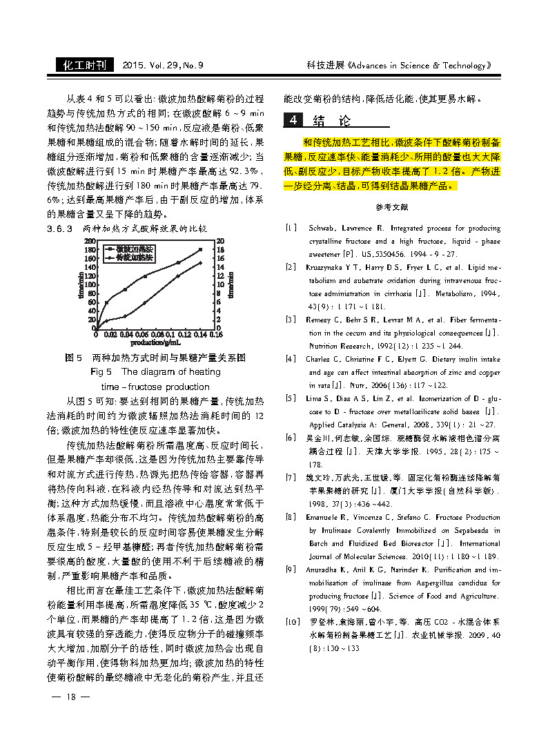 The preparation of fructose by acid hydrolysis of inulin under microwave condition was studied. The effects of inulin concentration, temperature, pH value and reaction time on the preparation of fructose by acid-soluble inulin under microwave condition were studied by single factor experiment. The optimum process conditions for inulin hydrolysis were determined: inulin concentration 15%, temperature 55 ° C, solution pH 5, microwave irradiation time 15 min, and fructose yield was 92.3% under this condition. Compared with the traditional heating process, the preparation of fructose by acidolysis inulin under microwave conditions has a fast reaction rate, low energy consumption, a large reduction in the amount of acid used, less side reactions, and an increase in the yield of the target product.