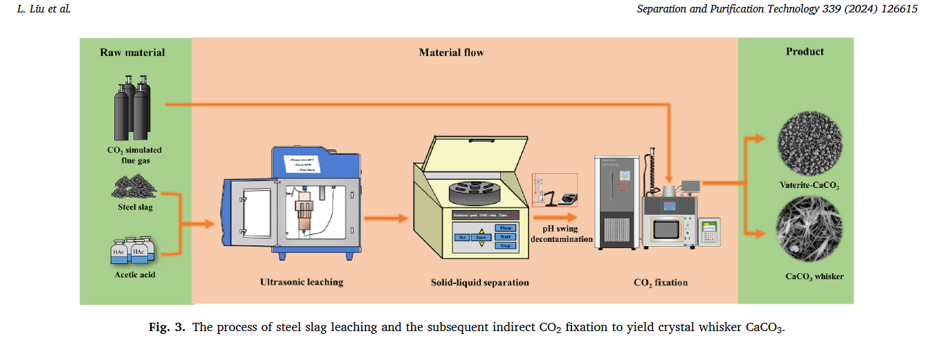 Indirect sequestration in steel slag refers to the leaching of calcium and magnesium minerals from slag using a leaching medium. Subsequently, these dissolved alkaline substances react with the COin gas stream at pH greater than 7 to produce a stable carbonate product. [10,11] While the process has an extended procedural pathway, it is characterized by reduced energy requirements and the ability to produce high-purity CaCO products. However, there are many challenges to be addressed in the current methods of indirect storage in steel slag, including concerns about leaching media selection, quality control of CaCO products, and residue resource utilization. In the steel slag leaching process, the choice of leaching agent mainly revolves around strong acids [12–14], weak acids [15], and ammonium salt solutions. [16–18] Investigations have shown that the use of strong acids as leaching agents, such as hydrochloric acid, nitric acid, and sulfuric acid, places high demands on the acid resistance of leaching equipment. In addition, this method results in the extraction of a large number of impurity ions during the leaching process. A large amount of impurity remover is consumed during the purification process, which affects the quality of the carbonate product.
