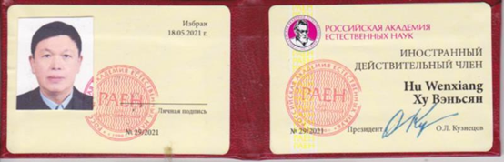世界著名的俄羅斯自然科學(xué)院(Russian Academy of Natural Sciences)院長(zhǎng)O.L. Kuznetsov,向我國(guó)知名航天軍事醫(yī)學(xué)、有機(jī)藥物化學(xué)與微波化學(xué)科學(xué)家胡文祥教授簽發(fā)俄羅斯自然科學(xué)院外籍院士當(dāng)選證書。