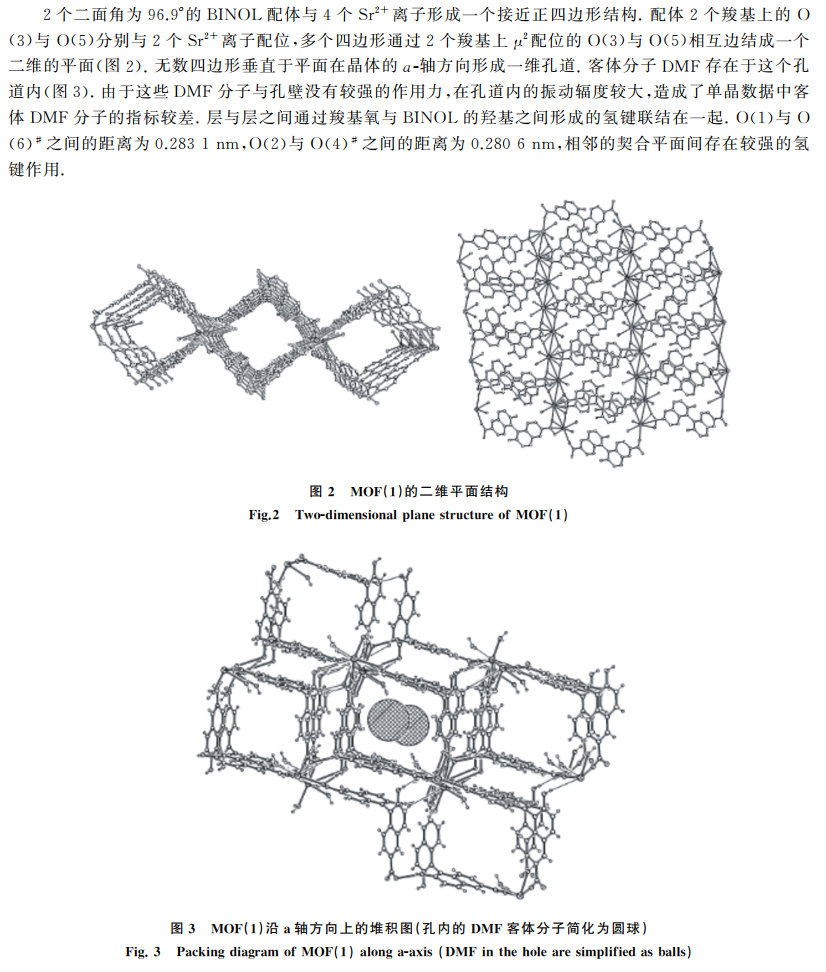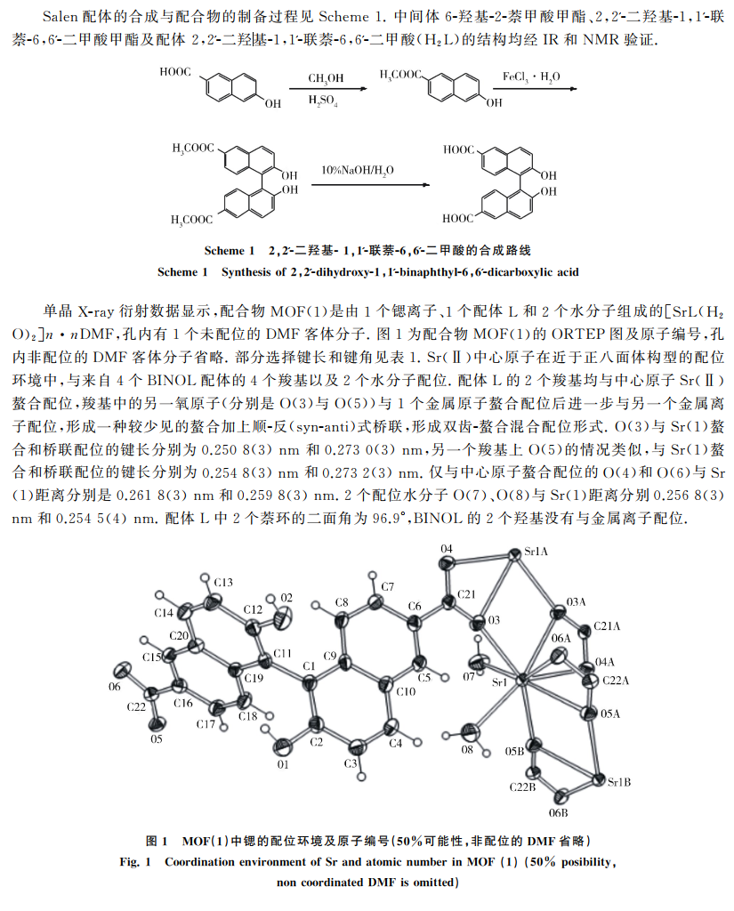以6-羥基-2-萘甲酸為原料,經(jīng)酯化、偶合、水解,得到2,2-二羥基-1,1-聯(lián)萘-6,6-二甲酸(H2L)配體,并以擴散法合成了一種新型二維BINOL-Sr(II)金屬有機框架MOF(1).配合物MOF(1)是由1個鍶離子、1個配體L和2個水分子組成的[SrL(H2O)2]nnDMF,MOF(1)晶體在a-軸方向有1個一維孔道,孔道內(nèi)填有未配位的DMF客體分子。
