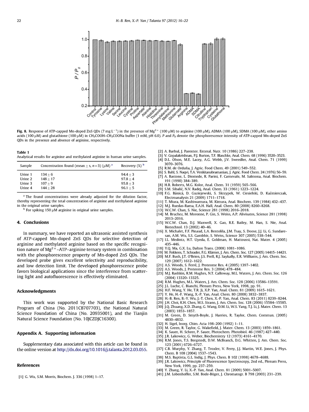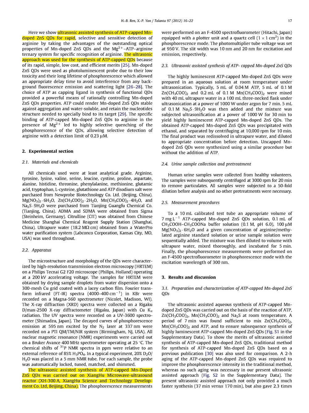 根據(jù)Mg2-ATP-精氨酸三元體系的特殊識(shí)別性質(zhì),結(jié)合Mn摻雜ZnS量子點(diǎn)的磷光性質(zhì),本文討論了一種用于選擇性檢測(cè)精氨酸和甲基化精氨酸的ATP帽摻雜ZnS量子點(diǎn)的超聲輔助合成。該探針選擇性好,重現(xiàn)性好,檢出限低。由于有效地消除了散射光和自熒光的干擾,研制的磷光探針有利于生物應(yīng)用。