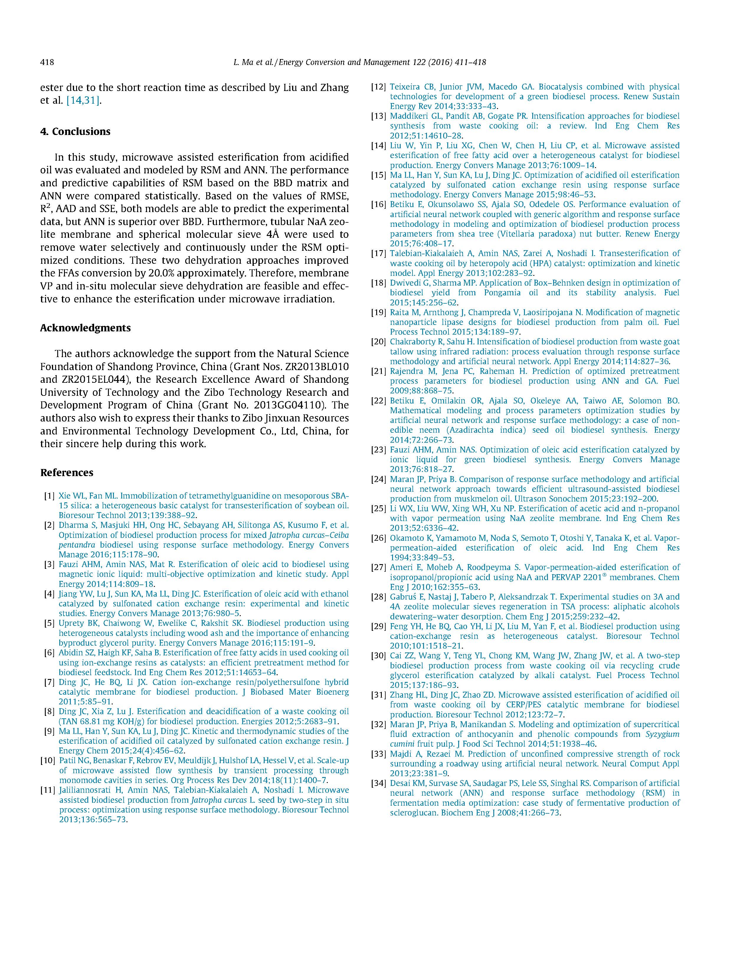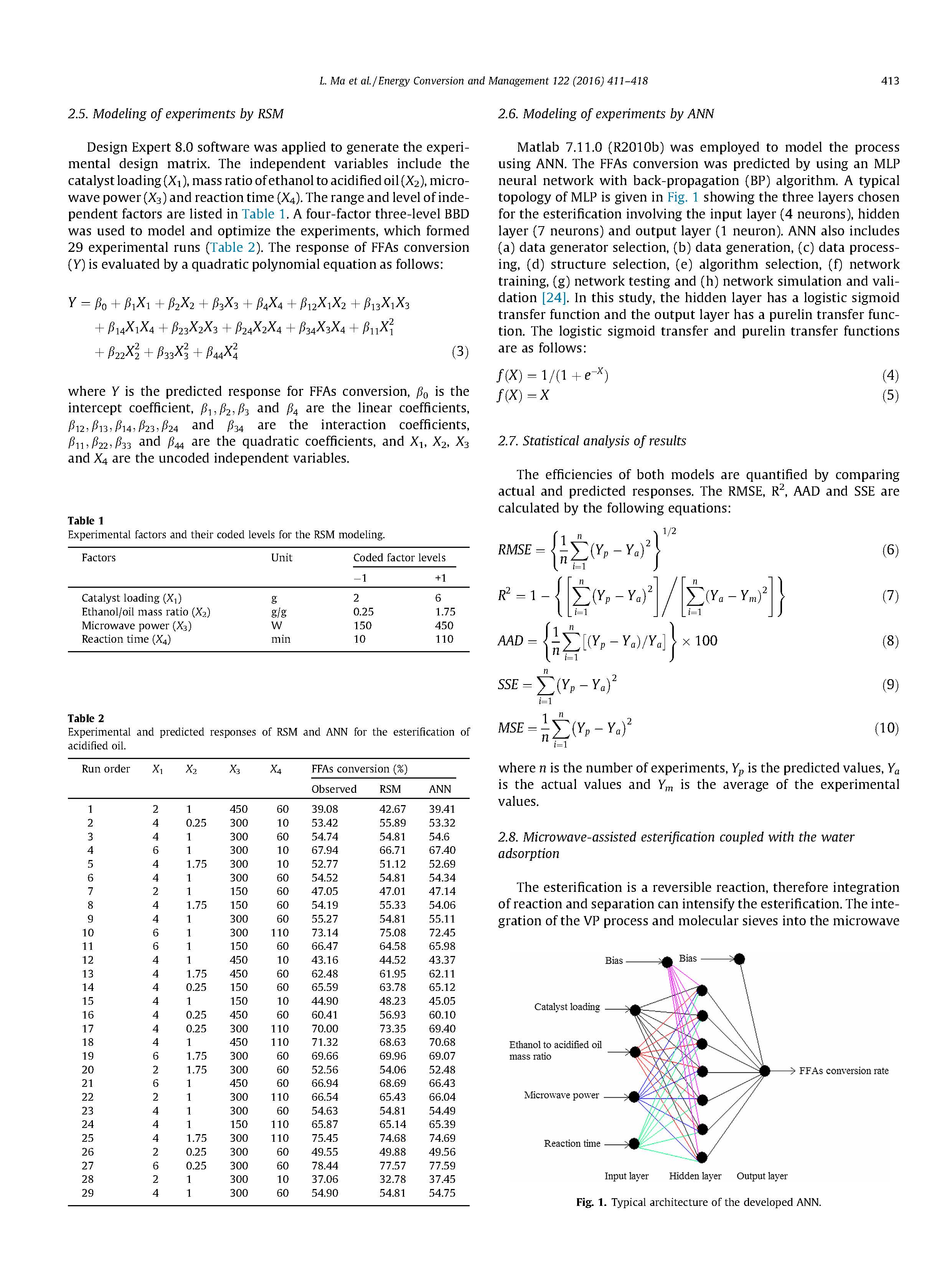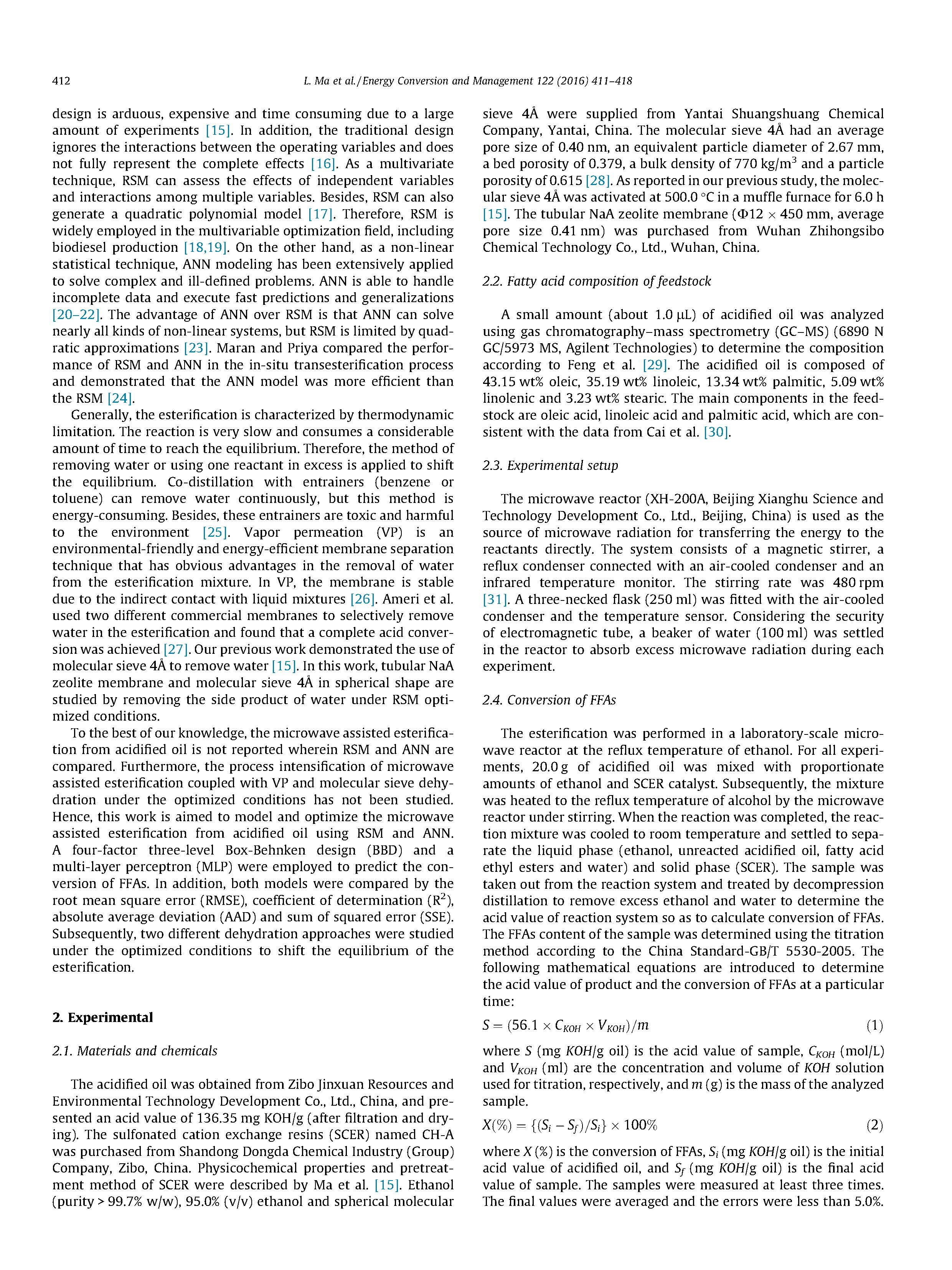 在本研究中,微波輔助酯化反應(yīng)酸化用RSM和ANN對石油進(jìn)行了評價(jià)和建模。性能以及基于BBD矩陣的RSM的預(yù)測能力,在統(tǒng)計(jì)學(xué)上對ANN進(jìn)行了比較。基于RMSE的值,R2、AAD和SSE,這兩種模型都能夠預(yù)測實(shí)驗(yàn)數(shù)據(jù),但ANN優(yōu)于BBD。此外,使用管式NAA沸石膜和球形分子篩4%,在RSM優(yōu)化條件下選擇性和連續(xù)地除去水。這兩種脫水方法得到了改進(jìn)FFAs轉(zhuǎn)化率約為20.0%。因此,膜在微波輻射下,VP和原位分子篩脫水是可行的和有效的。