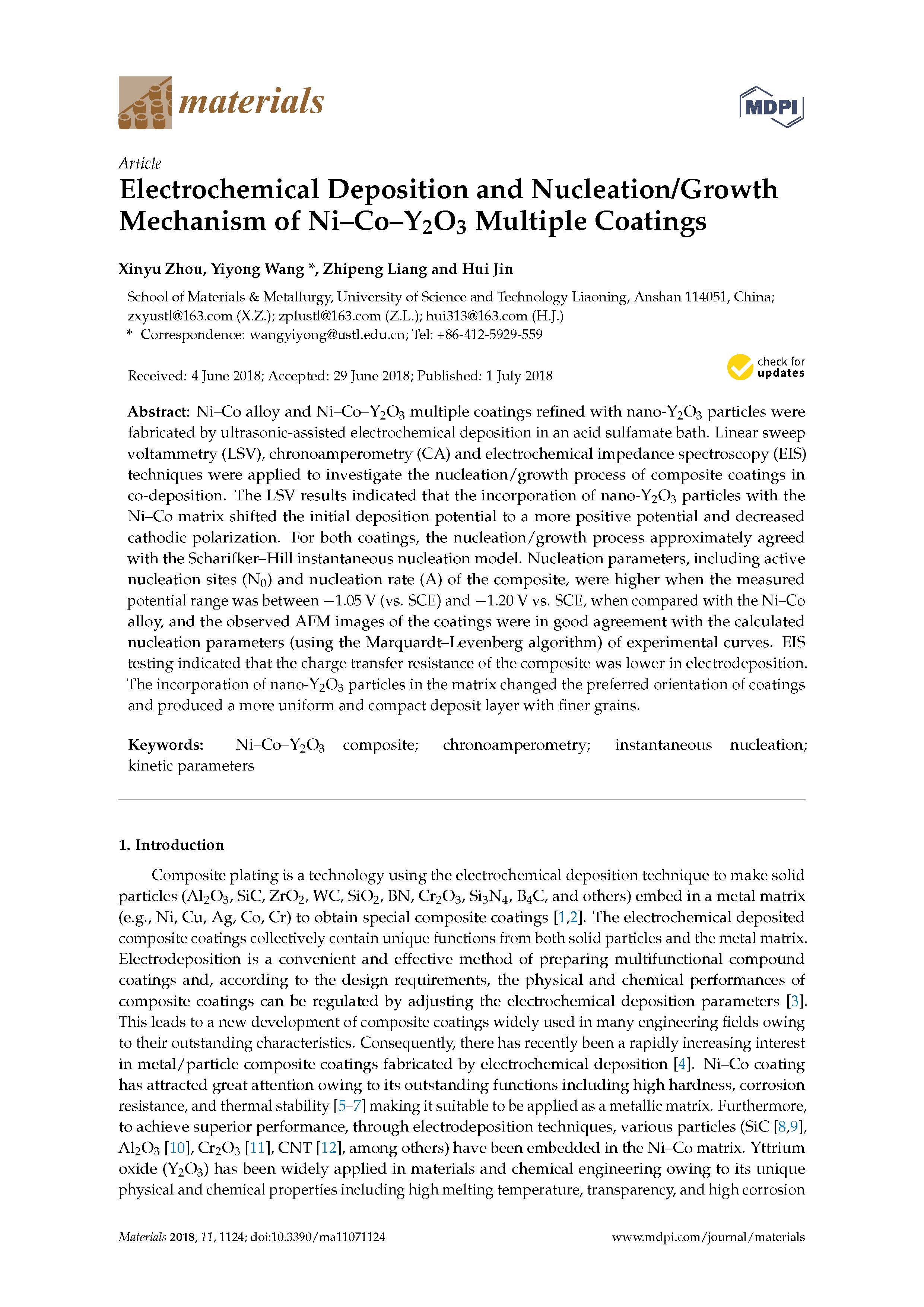 這篇由遼寧科技大學(xué)等的研究學(xué)者完成,討論Ni-Co-Y2O3復(fù)合涂層的電化學(xué)沉積及成核/生長機(jī)理的論文,發(fā)表在二區(qū)重要期刊《Materials》,影響因子:2.467。