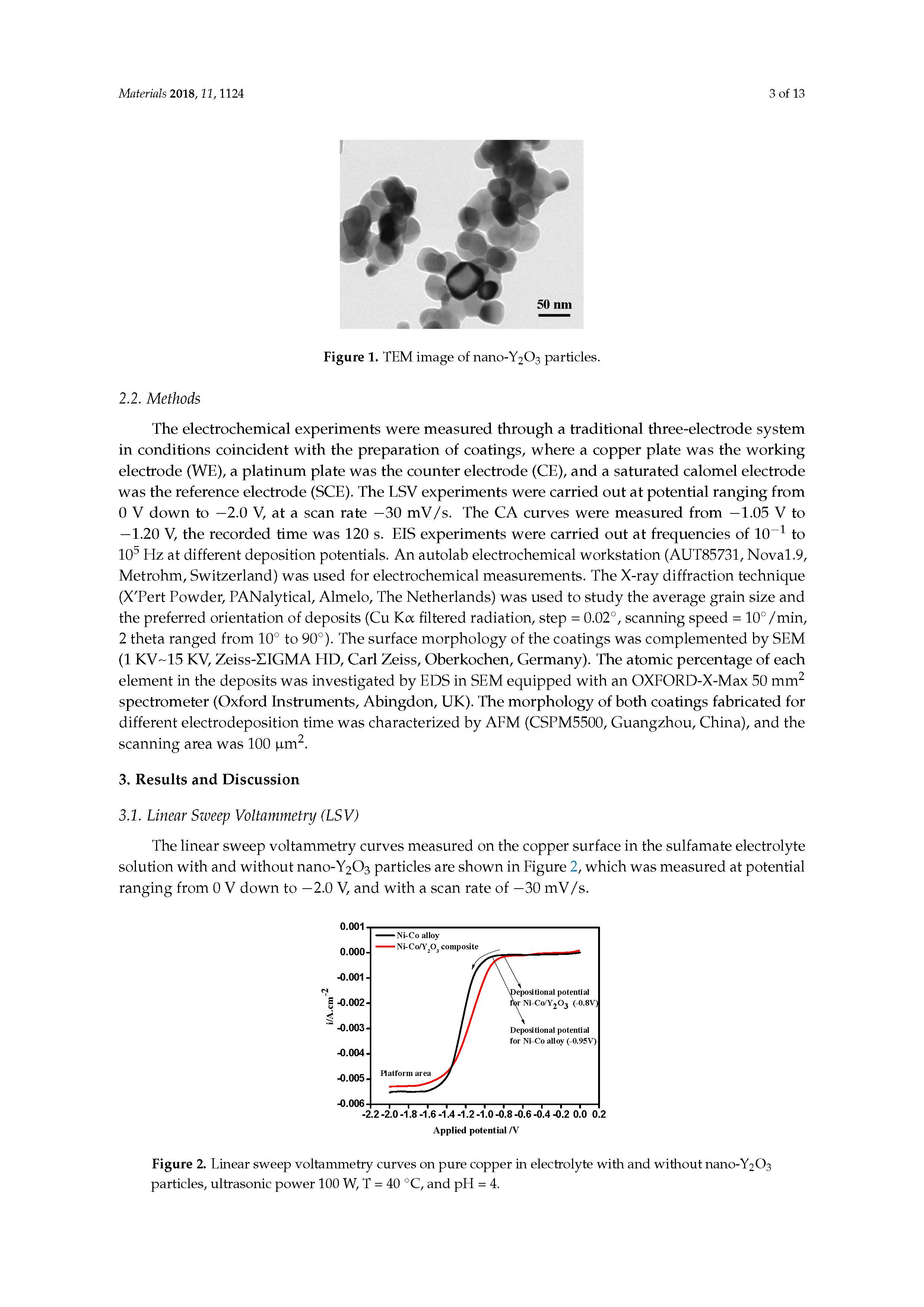 LSV結(jié)果表明,納米Y2O3粒子與Ni-Co基體的加入使初始沉積電位向正電位方向移動,陰極極化降低。對于這兩種涂層,成核/生長過程大致符合Scharifker-Hill瞬時(shí)成核模型。與Ni-Co合金相比,當(dāng)−1.05V(vs.SCE)和−1.20V(vs.SCE)之間時(shí),復(fù)合材料的成核參數(shù)(包括活性形核中心(N0)和成核速率(A)較高。觀察到的AFM圖像與實(shí)驗(yàn)曲線的成核參數(shù)(采用Marquardt-Levenberg算法)吻合較好。