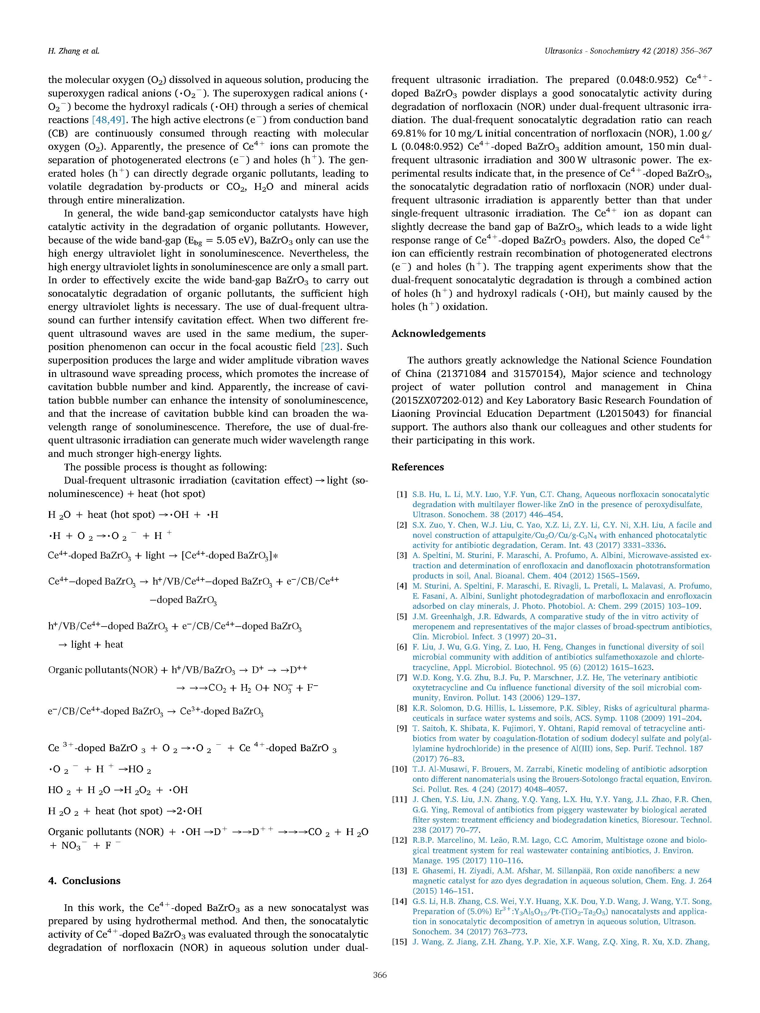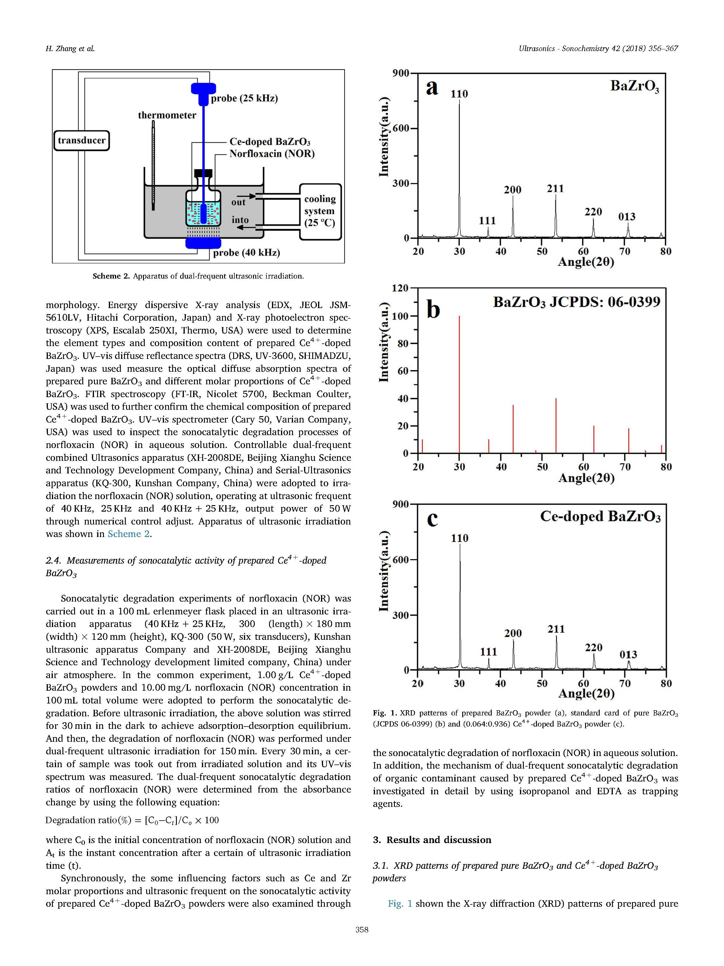 用X射線衍射儀(XRD)、掃描電鏡(SEM)、能量色散X射線能譜(EDX)、X射線光電子能譜(XPS)、紫外-可見(jiàn)漫反射光譜(DRS)和傅里葉變換紅外光譜(FT-IR)對(duì)樣品進(jìn)行了表征。通過(guò)對(duì)諾氟沙星(NOR)作為模型有機(jī)污染物的超聲催化降解,考察了制備的Ce4摻雜BaZrO 3粉體的雙頻聲催化活性。利用紫外-可見(jiàn)光譜對(duì)單/雙頻超聲頻率、鈰、鋯摩爾比、超聲輻照時(shí)間和使用次數(shù)等影響因素進(jìn)行了詳細(xì)研究。采用兩種不同的誘捕劑對(duì)諾氟沙星(NOR)雙頻超聲催化降解過(guò)程中產(chǎn)生的活性氧(ROS)進(jìn)行了確證。確定了孔洞(H)和羥基自由基(%OH),在氧化過(guò)程中空穴起主要作用。