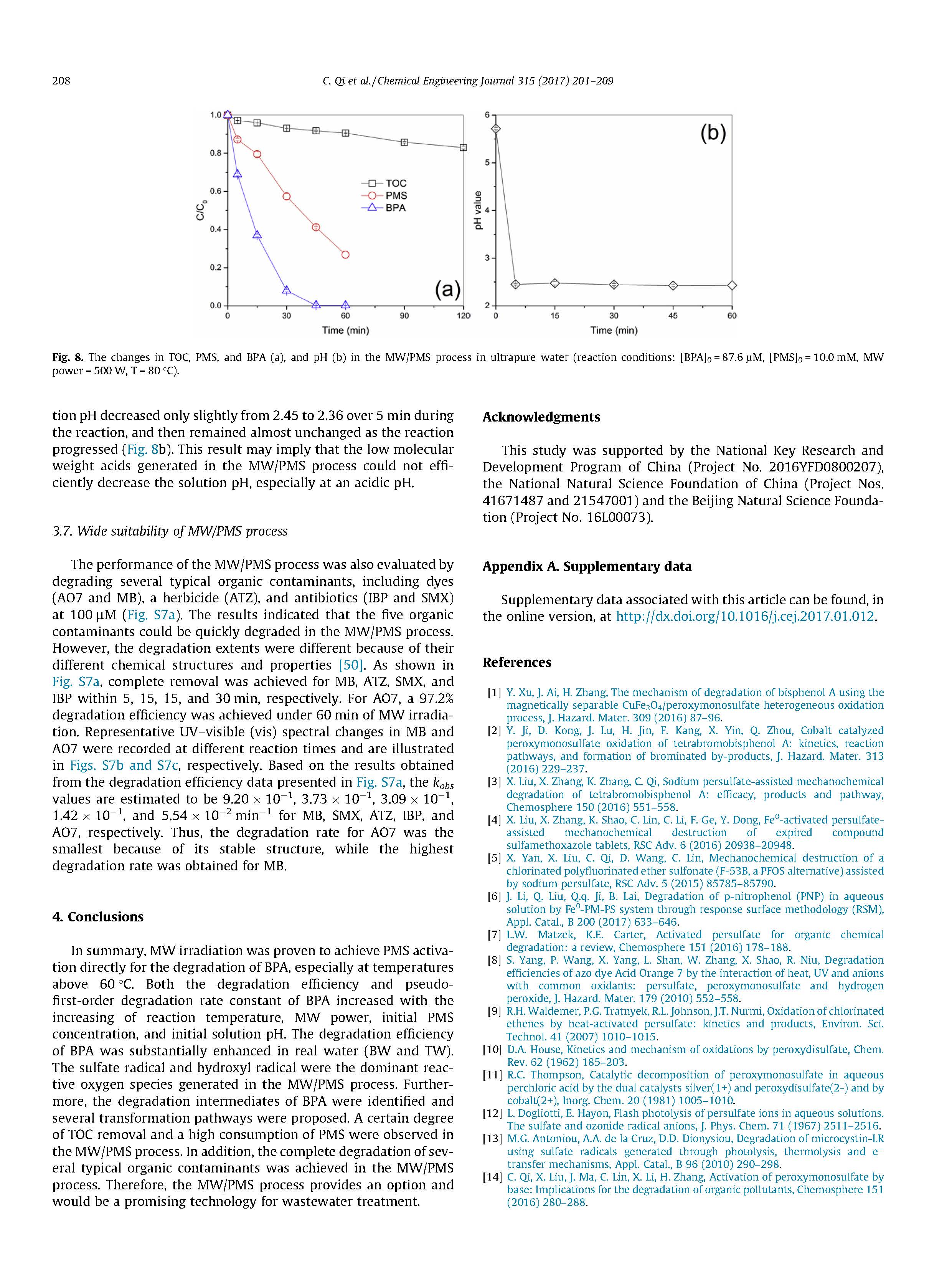 總之,驗證了MW輻照以直接實現(xiàn)PMS活化,以降解BPA,特別是在溫度下above60C.BPA的降解效率和假一級降解速率常數(shù)均隨溫度升高而增加。反應溫度升高,MW功率,初始PMS濃度和初始溶液pH值。降解效率在實際水中BPA顯著增強(BW和TW)。硫酸根和羥基是MW/PMS過程中產(chǎn)生的主要活性氧物質(zhì)。此外,鑒定了BPA的降解中間體,并提出了幾種轉(zhuǎn)化途徑。一定程度觀察到TOC去除和PMS的高消耗。MW/PMS流程。此外,在MW/PMS中實現(xiàn)了幾種典型有機污染物的完全降解。工藝。因此,MW/PMS流程提供了一個選項,是一種有前途的廢水處理技術(shù)。