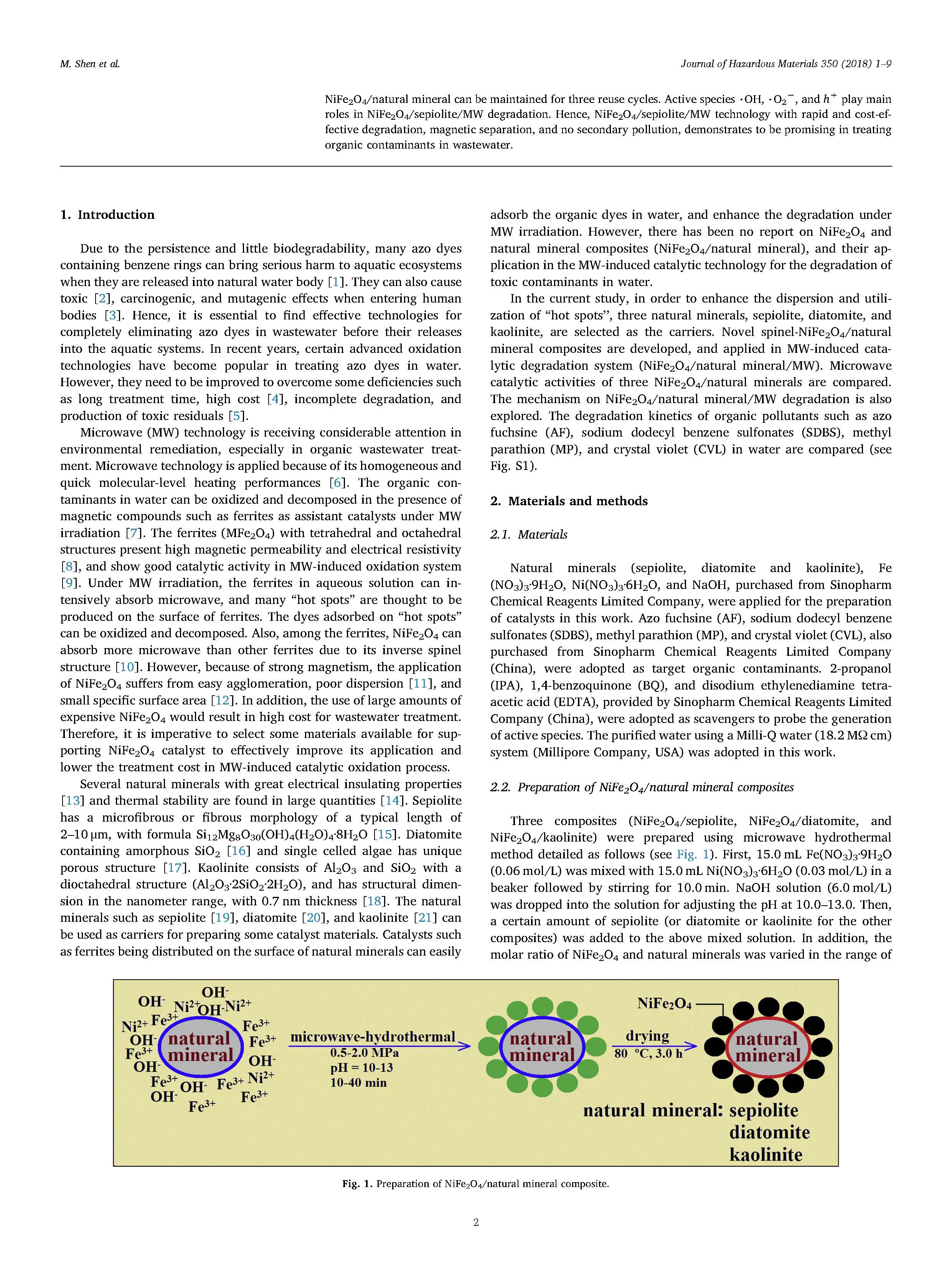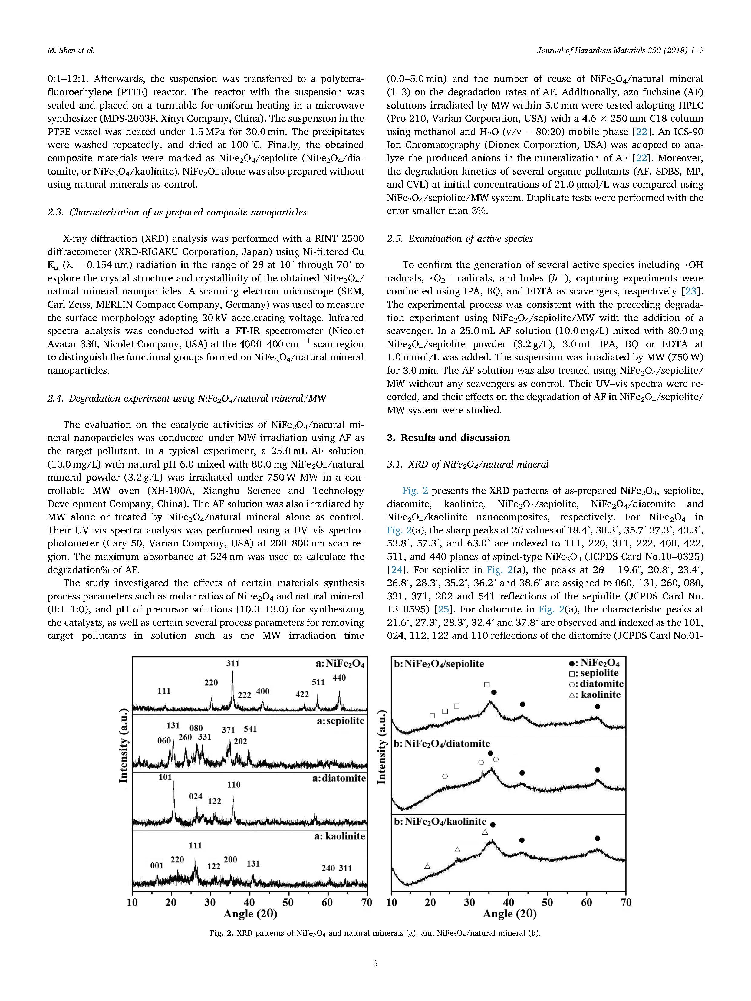 本研究采用微波水熱法制備了尖晶石-NiFe2O4/天然礦物(海泡石、硅藻土和高嶺石)復(fù)合材料,并將其應(yīng)用于十二烷基苯磺酸鈉(SDBs)、偶氮胂(AF)、甲基對硫磷(MP)等有機(jī)污染物的微波催化降解(NiFe2O4/天然礦物/mw)中,以及溶液中的結(jié)晶紫(CVL)。