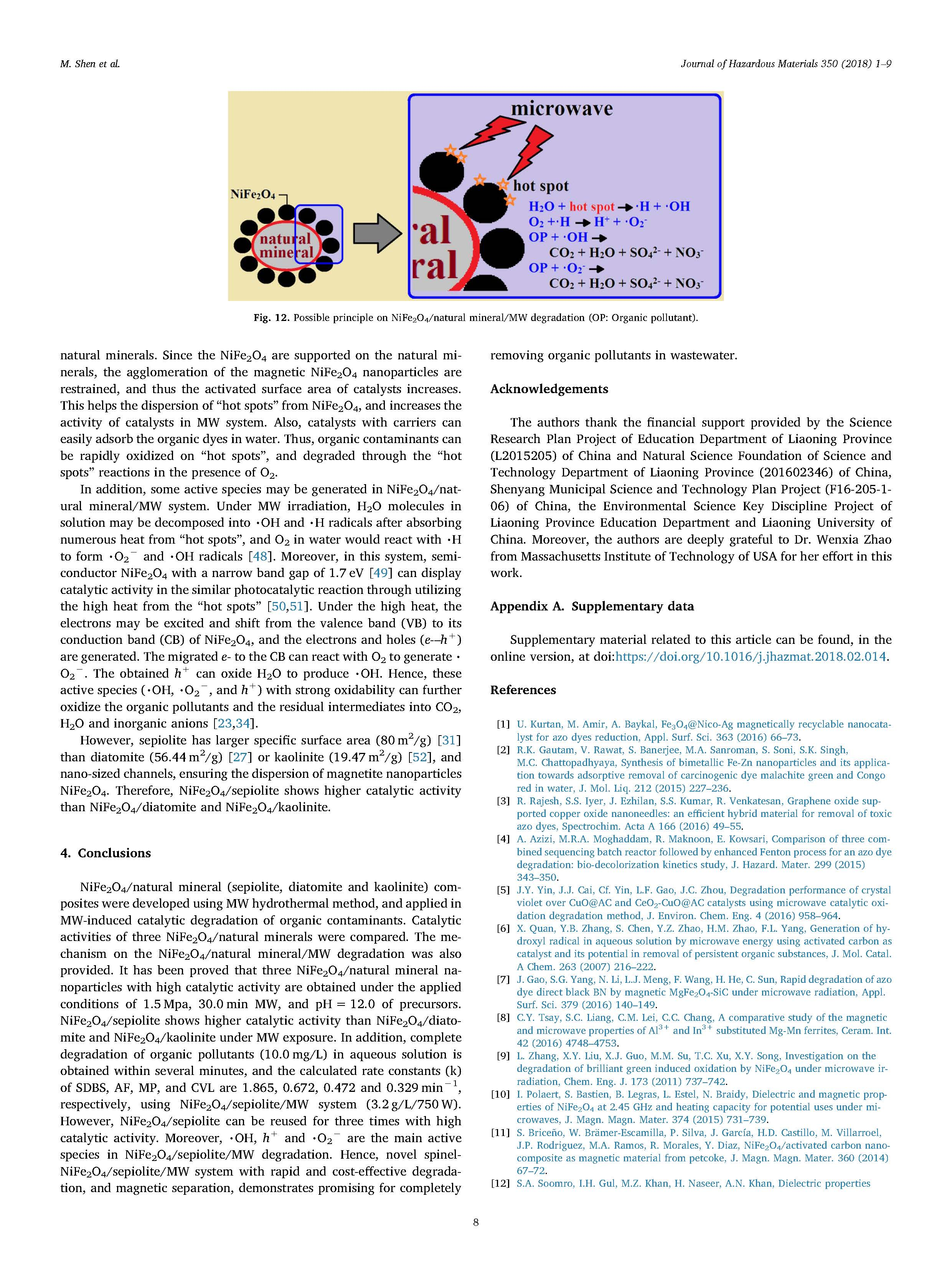 比較了三種NiFe2O4/天然礦物復(fù)合材料的催化活性,考察了原料合成工藝參數(shù)如NiFe2O4與天然礦物的摩爾比、催化劑前驅(qū)體溶液的pH值、微波輻射時(shí)間和催化劑重復(fù)使用周期等降解參數(shù)對催化劑性能的影響。給出了NiFe2O4/天然礦物/MW降解的原理。結(jié)果表明,NiFe2O4/天然礦物/MW可在幾分鐘內(nèi)完全去除廢水中的有機(jī)污染物。NiFe2O4/海泡石具有較高的催化活性。在NiFe2O4/海泡石/MW體系中,SDBS、AF、MP和CVL的降解速率常數(shù)分別為1.865、0.672、0.472和0.329 min-1。NiFe2O4/天然礦物的性能可維持三次循環(huán)?;钚晕锓N %OH, %O2-和h+對NiFe2O4/海泡石/MW的降解起主要作用。