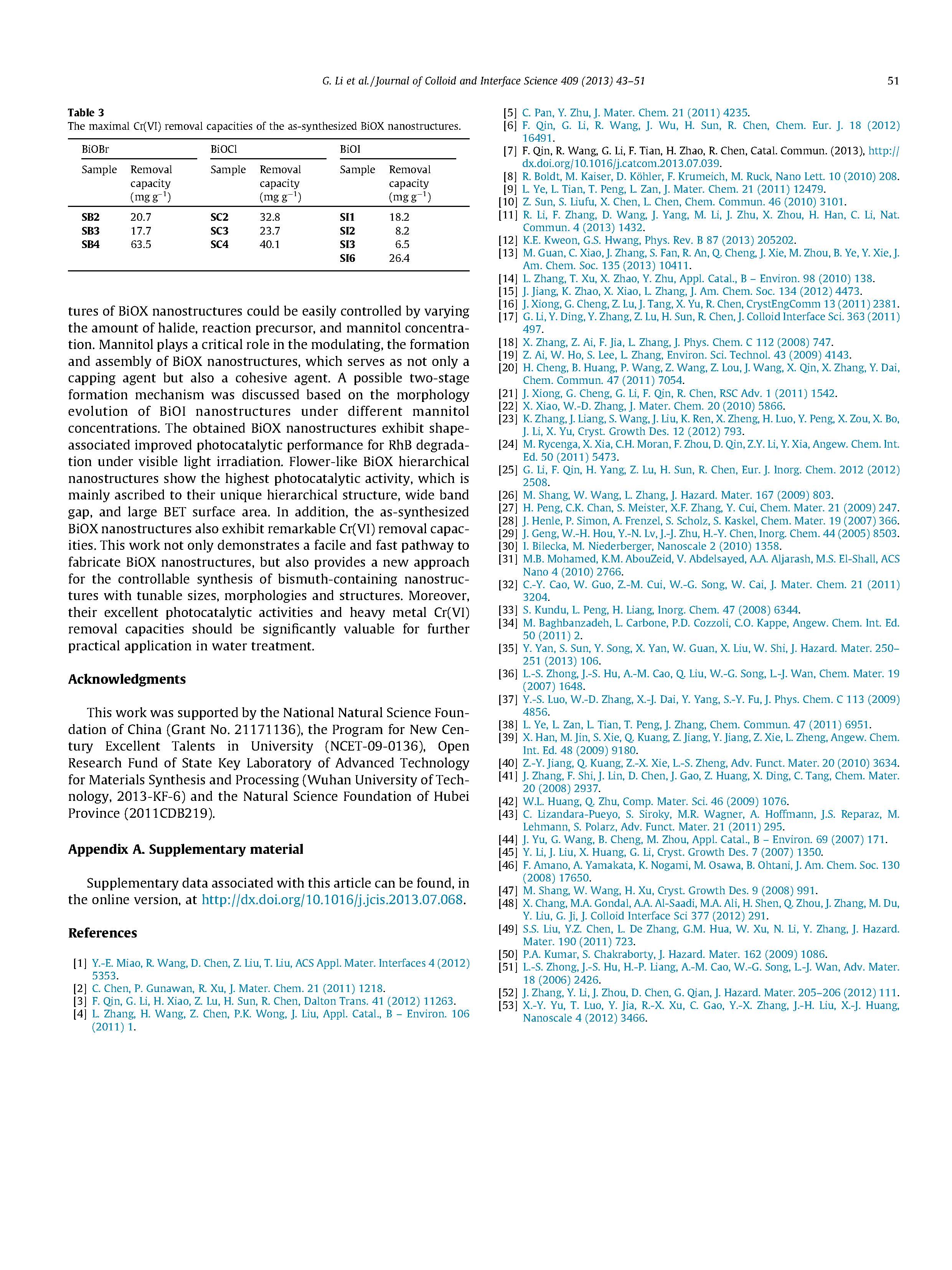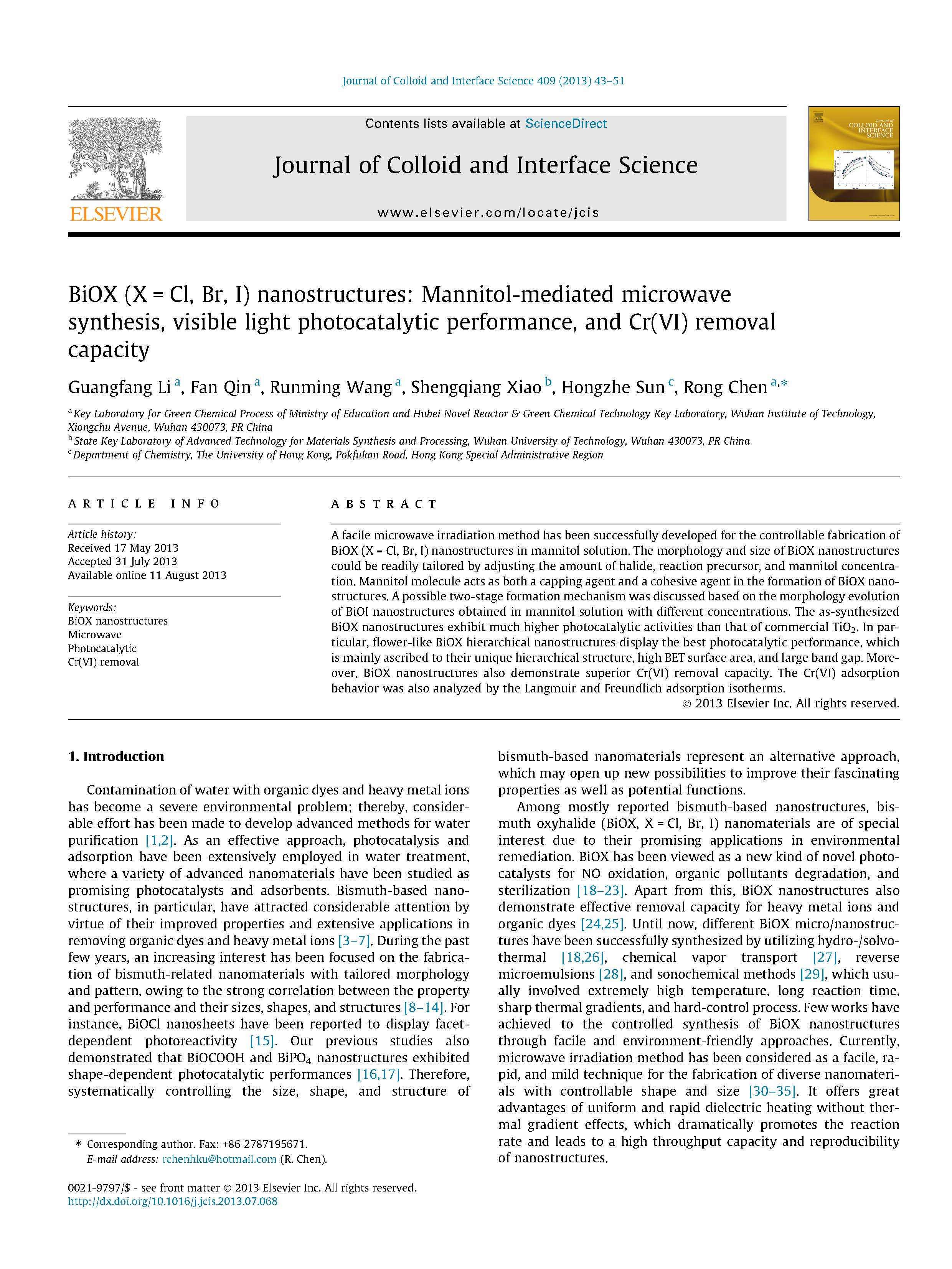 綜上所述,在甘露醇溶液中,微波輻射法成功地合成了BIOX(X=Cl,Br,I)納米結(jié)構(gòu)。通過(guò)改變鹵化物、反應(yīng)前驅(qū)體和甘露醇濃度,可以很容易地控制BIOX納米結(jié)構(gòu)的尺寸、形貌和結(jié)構(gòu)。甘露醇在BIOX納米結(jié)構(gòu)的調(diào)控、形成和組裝中起著至關(guān)重要的作用,它既是一種封蓋劑,又是一種粘聚劑。根據(jù)BiOI納米結(jié)構(gòu)在不同甘露醇濃度下的形貌演變,討論了一種可能的兩階段形成機(jī)制。所得到的BIOX納米結(jié)構(gòu)在可見(jiàn)光照射下對(duì)RhB的降解表現(xiàn)出形態(tài)相關(guān)的光催化性能改善?;ɑ軤頑IOX分級(jí)納米結(jié)構(gòu)具有最高的光催化活性,其主要原因是其獨(dú)特的層次結(jié)構(gòu)、寬的帶隙和大的BET比表面積。此外,合成的BIOX納米結(jié)構(gòu)也具有顯著的去除Cr(VI)能力.本工作不僅為BIOX納米結(jié)構(gòu)的制備提供了一條簡(jiǎn)便、快速的途徑,而且為可控合成尺寸、形貌和結(jié)構(gòu)可調(diào)的含鉍納米結(jié)構(gòu)提供了一條新的途徑。此外,它們具有良好的光催化活性和去除重金屬Cr(VI)的能力,在水處理中具有重要的實(shí)際應(yīng)用價(jià)值。