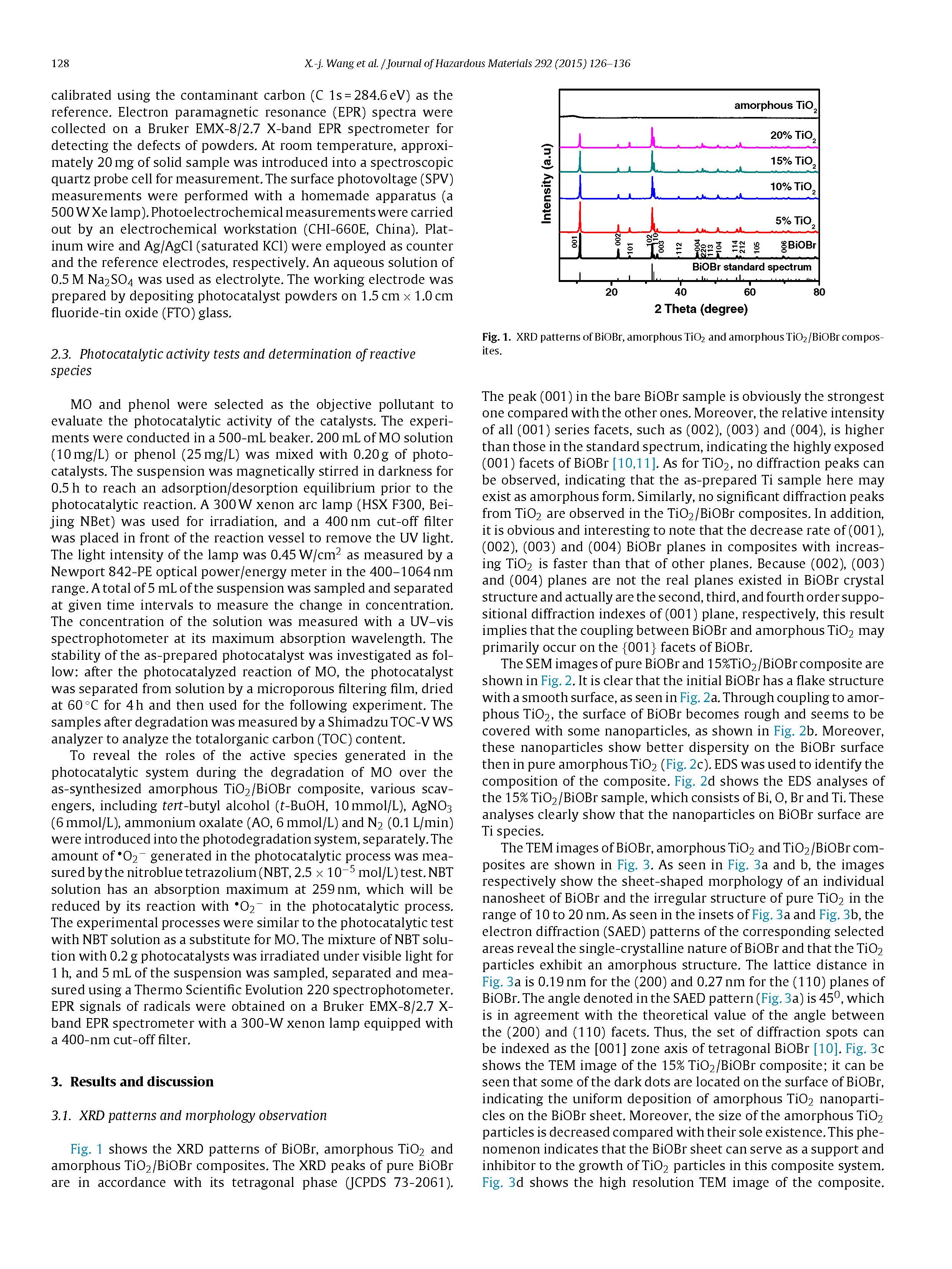 采用原位生長(zhǎng)法合成了由非晶態(tài)TiO 2與以{001}面為主的BiOBr相結(jié)合的新型復(fù)合材料。適當(dāng)?shù)闹苽浞椒ㄊ狗蔷B(tài)TiO 2納米粒子在BiOBr片表面得到了高度分散的納米粒子。由于BiOBr的{001}面與非晶態(tài)TiO 2之間的異質(zhì)界面分布均勻,非晶態(tài)TiO 2中的缺陷水平可以作為BiOBr的有效電子受體,因此,BiOBr中光生電子空穴對(duì)的分離得到了明顯的改善,從而有效地提高了BiOBr的光催化活性。15%TiO 2/BiOBr的光催化活性是純BiOBr的3.4倍。本研究為拓寬TiO 2的應(yīng)用范圍,開發(fā)高效的BiOBr基光催化劑提供了新的思路。