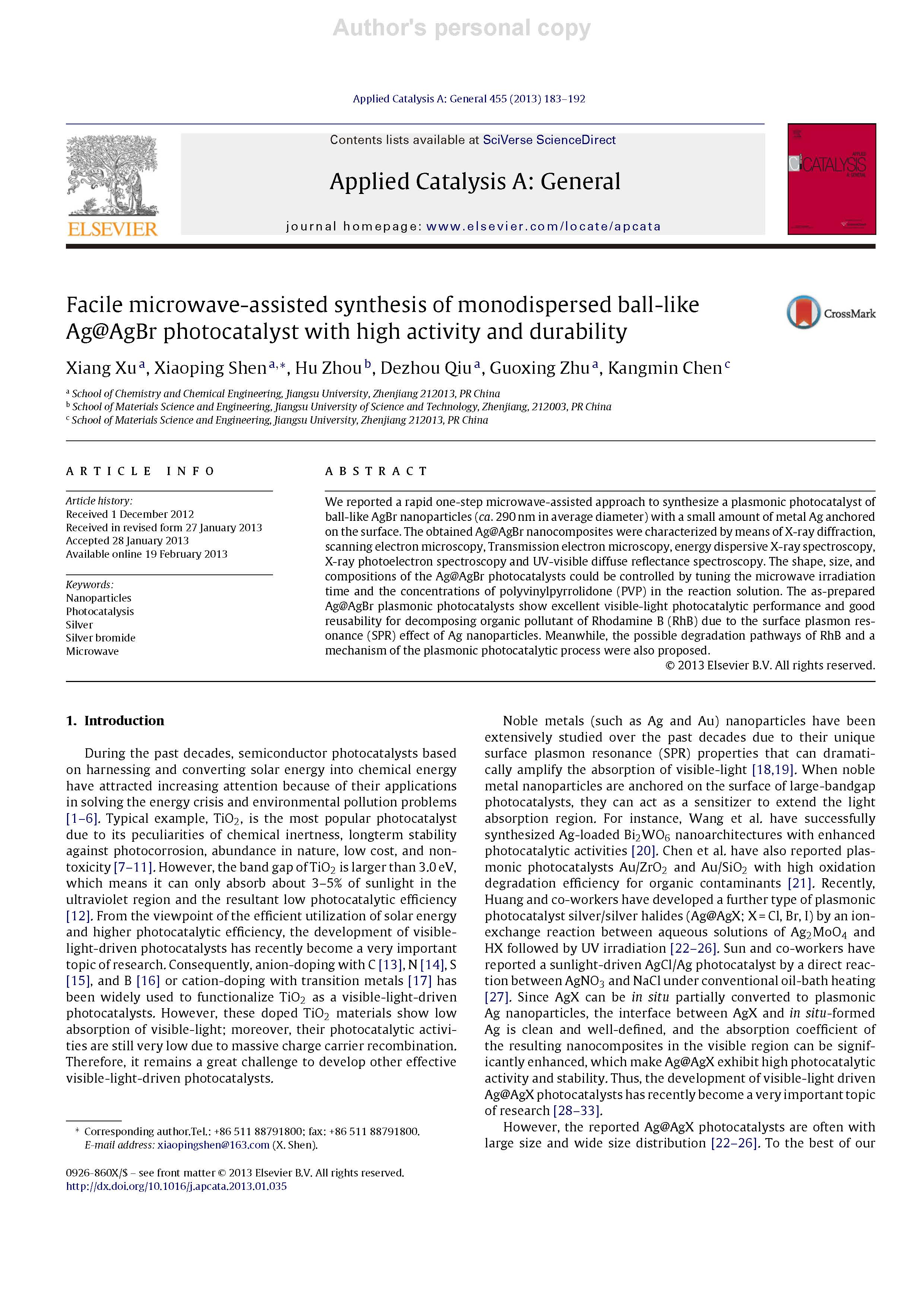 這篇由中國海洋大學等的研究學者完成,討論簡單的微波輔助合成單分散球狀Ag @ AgBr光催化劑,具有高活性和耐久性的論文,發(fā)表在二區(qū)重要期刊《Applied Catalysis A: General》,影響因子:4.521。