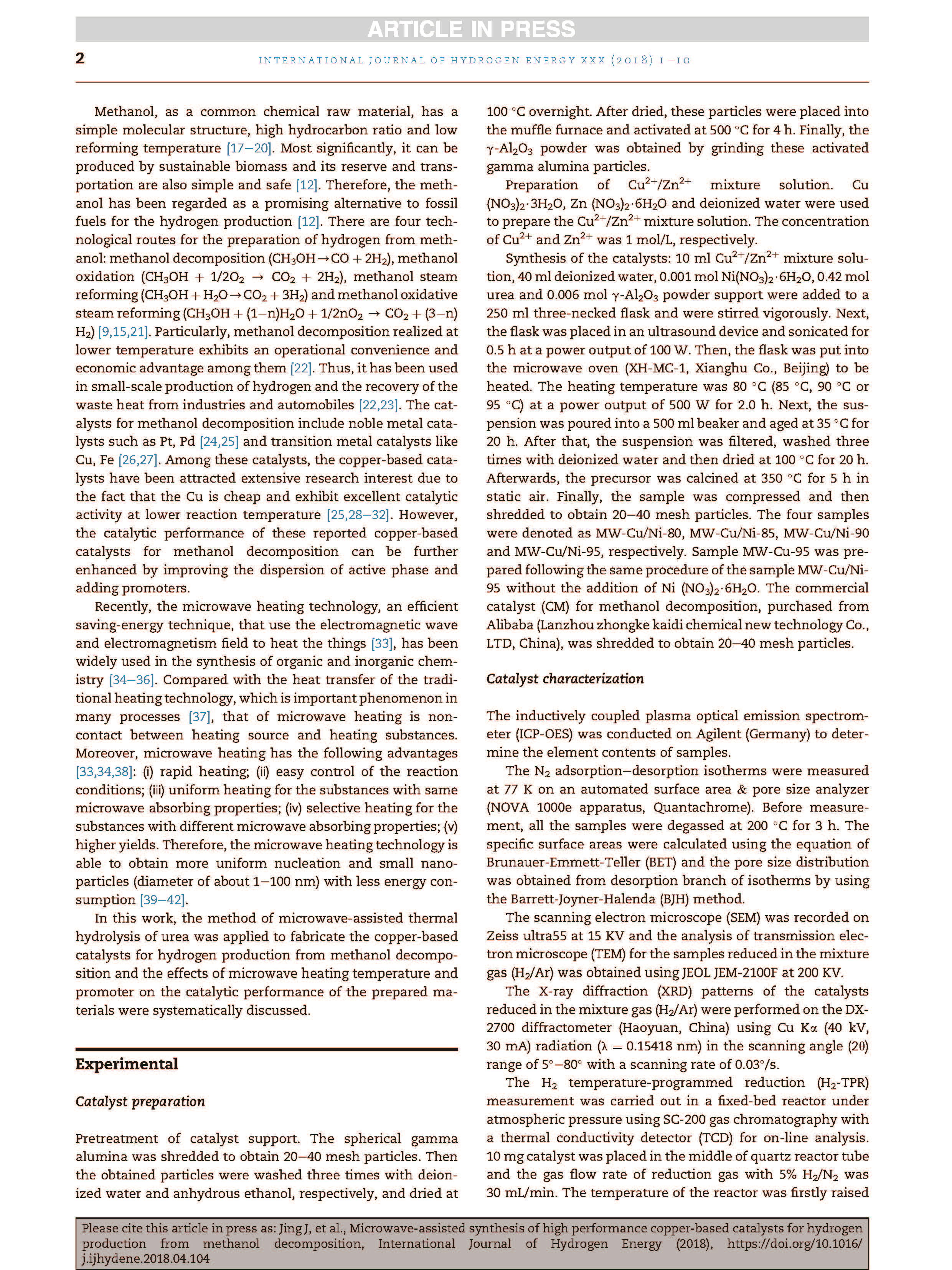 微波輔助合成高性能銅基催化劑,用于甲醇分解制氫