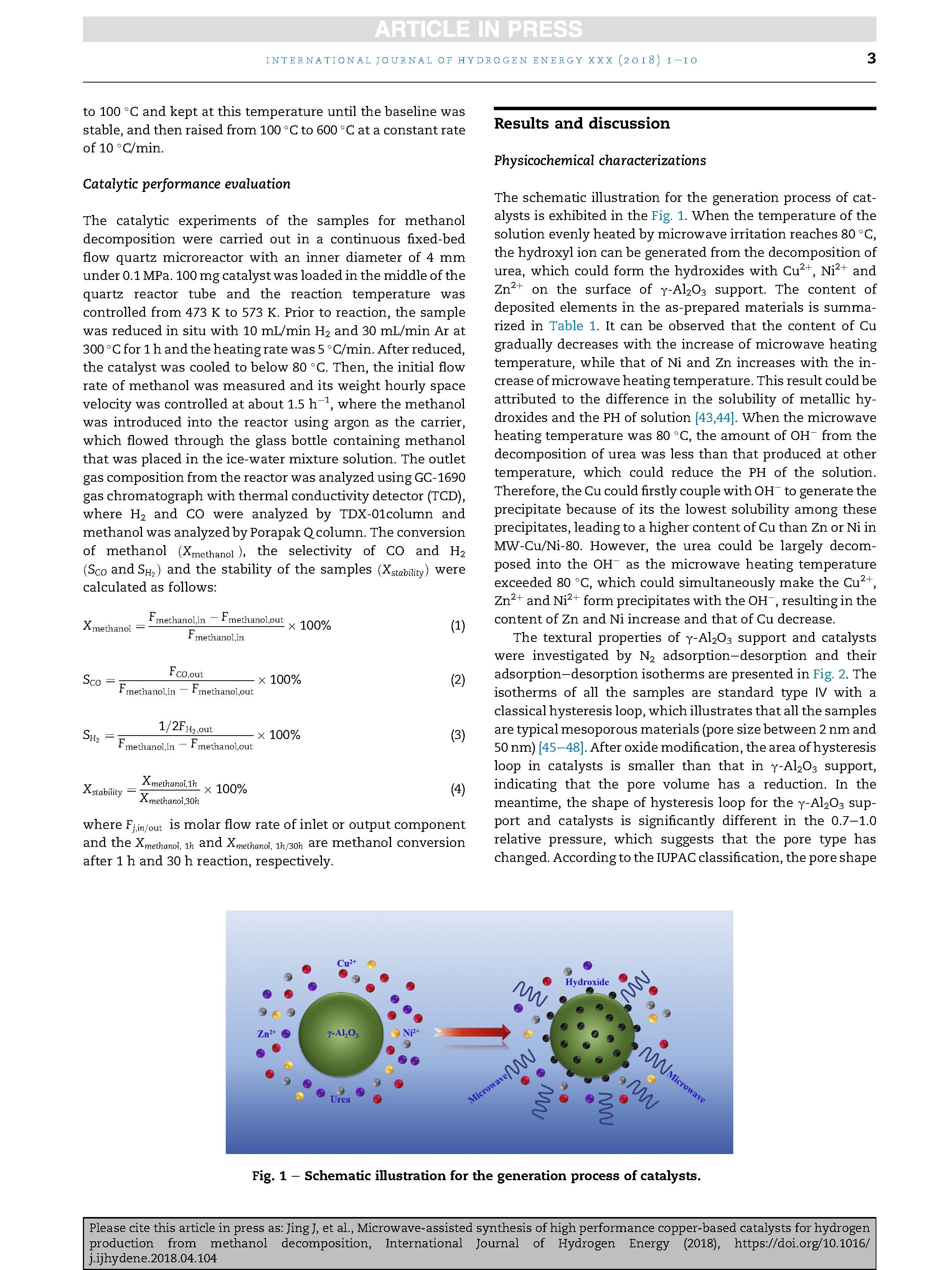 在250 ml三頸瓶中加入10 ml Cu2/Zn2混合液、40 ml去離子水、0.001 mol Ni(NO3)2$6H2O、0.42 mol尿素和0.006 mol g-Al2O3粉末載體,合成催化劑。然后,將燒瓶置于超聲波裝置中,在功率為100 W的情況下,超聲處理0.5h,然后將燒瓶放入微波爐(北京祥鵠公司XH-MC-1)加熱。加熱溫度為80。C(85)c,90C或95(C)輸出功率為500 W,持續(xù)時間為2.0小時。然后,將懸浮液倒入500毫升燒杯中,并在35歲時老化。然后用去離子水沖洗三次,然后在100℃干燥。然后,先在350℃煅燒。c在靜止空氣中作用5h。最后,對樣品進行壓縮,然后將其切碎,得到20e40目顆粒。4種樣品分別為MW-Cu/Ni-80、MW-Cu/Ni-85、MW-Cu/Ni-90和MW-Cu/Ni-95。在不添加Ni(NO3)2$6H2O的情況下,采用相同的方法制備了MW-Cu/Ni-95樣品。從阿里巴巴(蘭州中科凱迪化工新技術有限公司)購買的甲醇分解工業(yè)催化劑(CM)被粉碎,得到20 e40目顆粒。