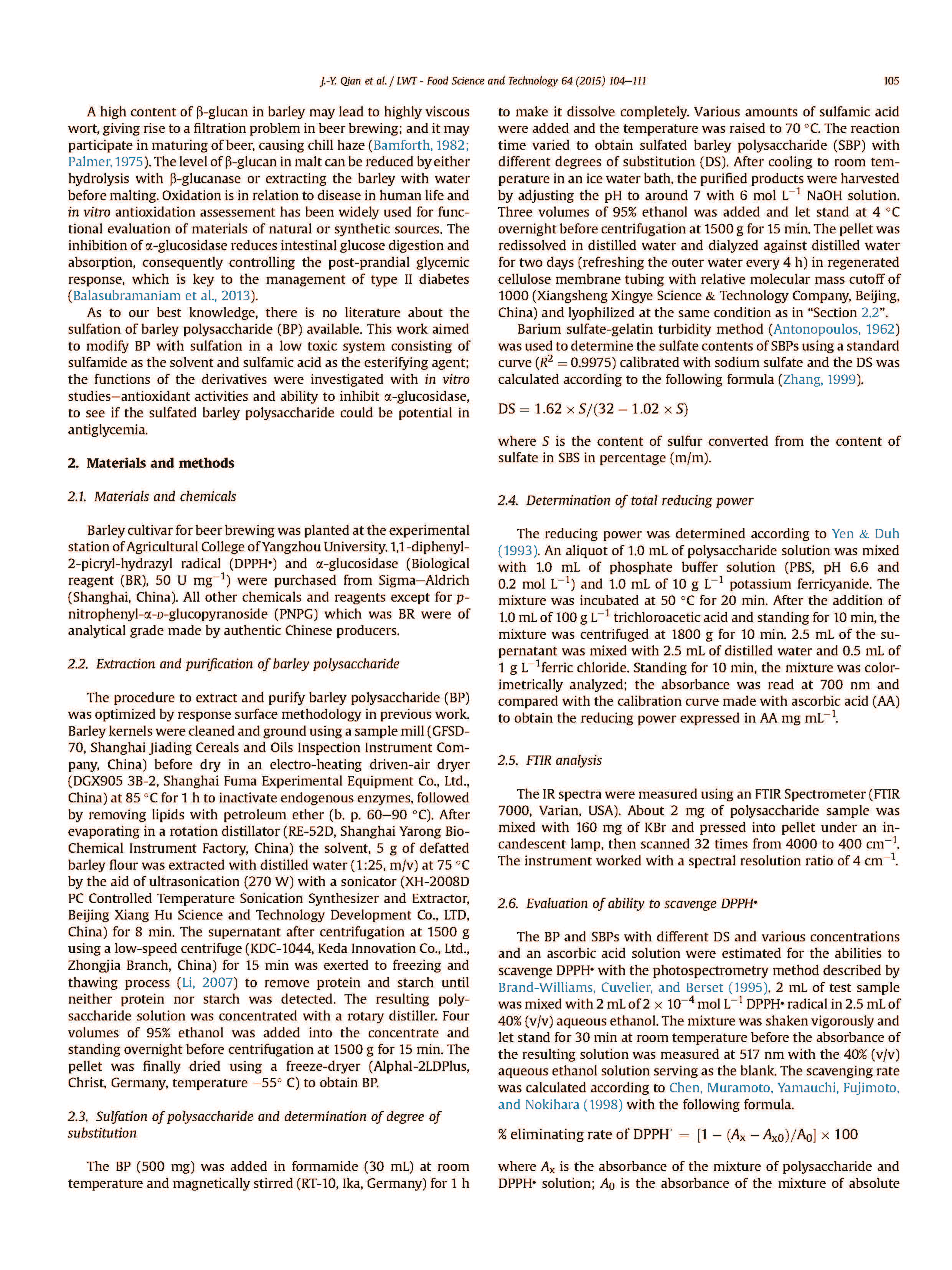大麥?zhǔn)且环N尋求更高附加值的谷物。其b-葡聚糖作為一種可溶膳食纖維受到人們的廣泛關(guān)注.利用超聲波輔助提取啤酒用大麥多糖(BP),用較低毒性的酯化劑-氨基磺酸提取不同取代度(DS)的大麥多糖(SBPs)。