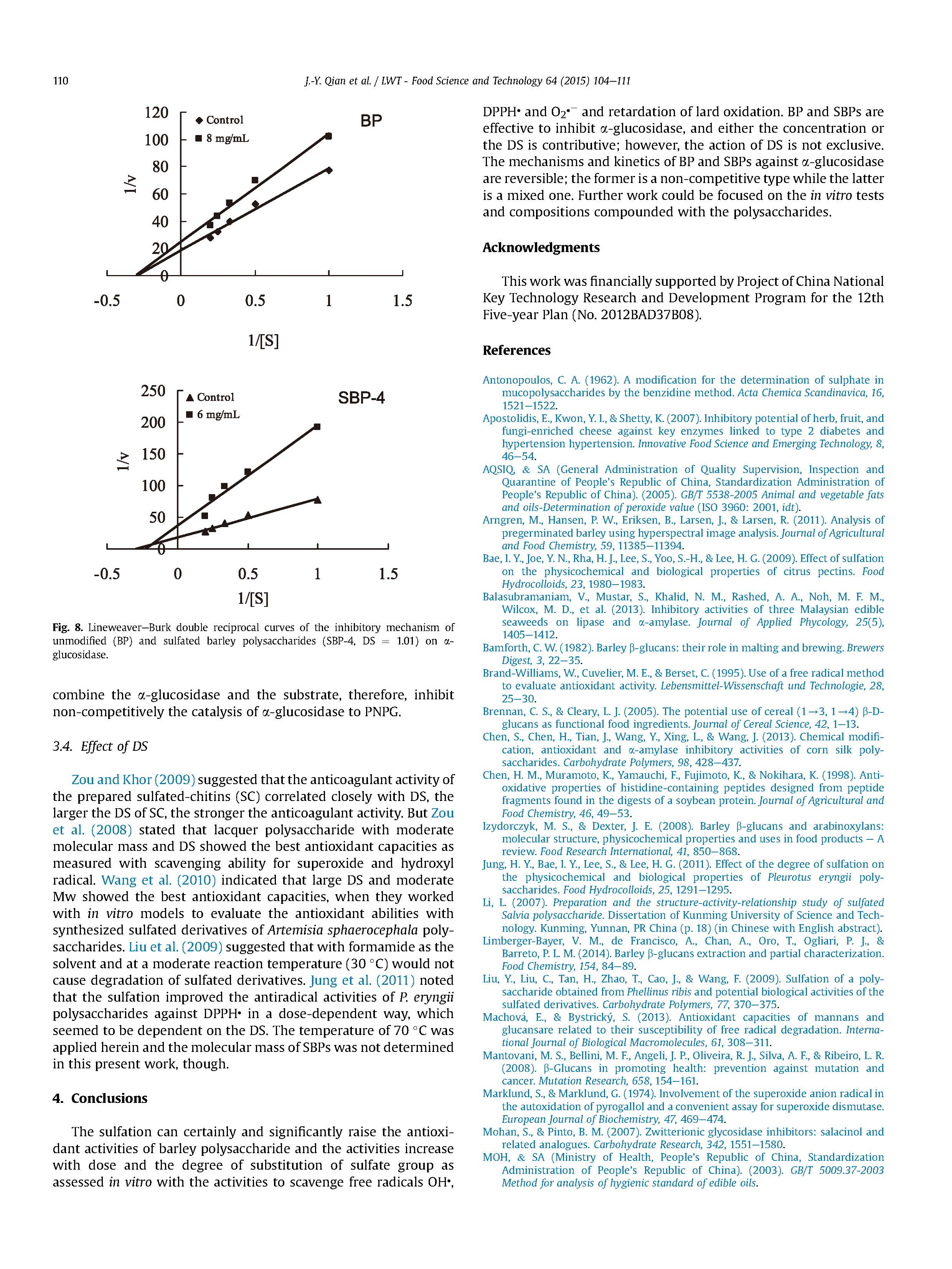硫酸化能明顯提高大麥多糖的抗氧化活性,其活性隨硫酸根取代度和劑量的增加而增加。DPPH和O2,抑制豬油氧化。BP和SBPs對(duì)α-葡萄糖苷酶有明顯的抑制作用,其濃度和DS均有一定的促進(jìn)作用,但DS的作用并不是排他性的。BP和SBPs對(duì)α-葡萄糖苷酶的作用機(jī)理和動(dòng)力學(xué)是可逆的,前者為非競(jìng)爭(zhēng)性型,后者為混合型。進(jìn)一步的工作可以集中在體外試驗(yàn)和組合物與多糖。