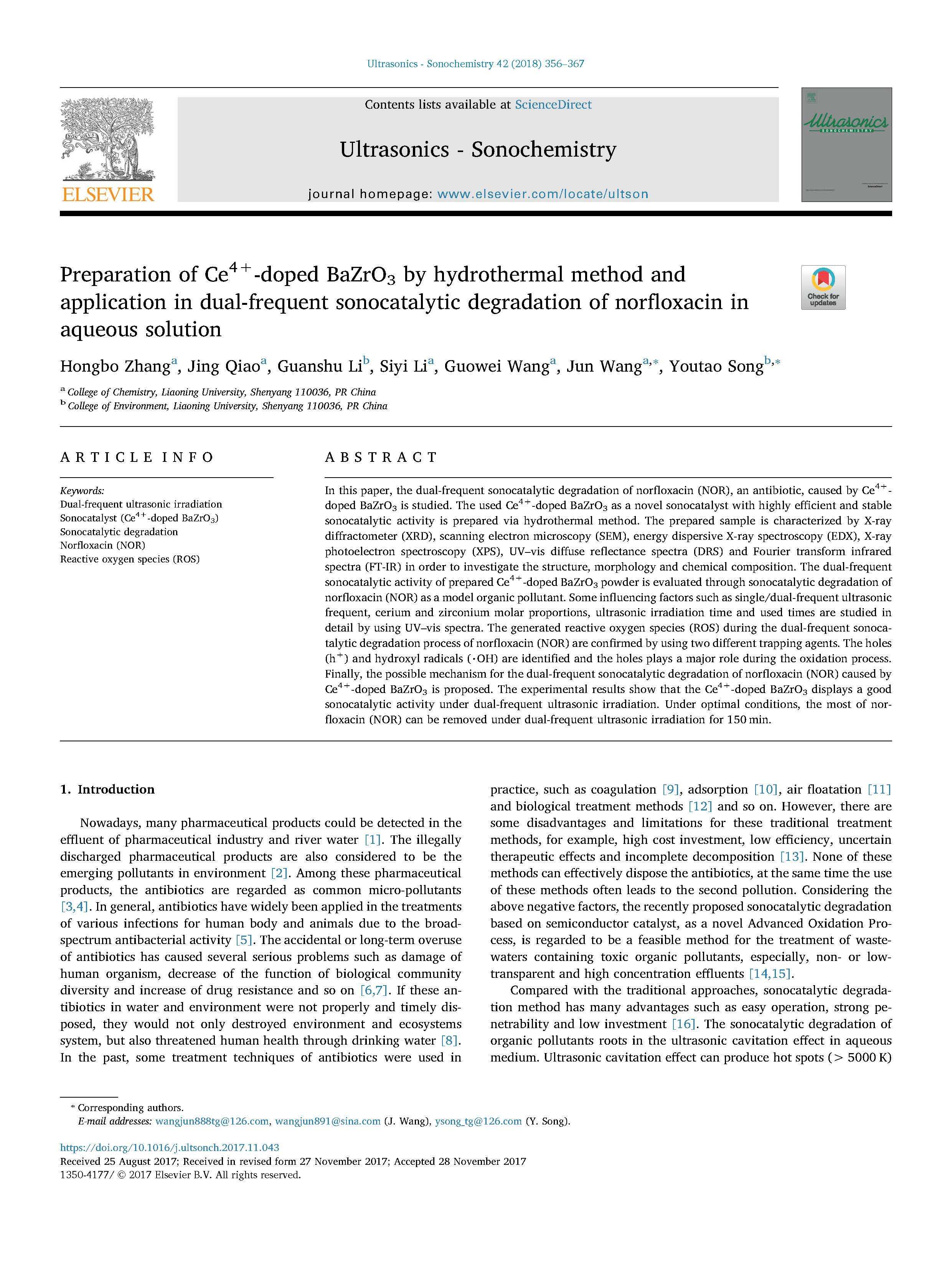 本文研究了Ce4摻雜BaZrO 3對(duì)抗生素諾氟沙星(NOR)的雙頻催化降解,采用水熱法制備了Ce4摻雜BaZrO 3作為一種高效、穩(wěn)定的新型聲催化劑。