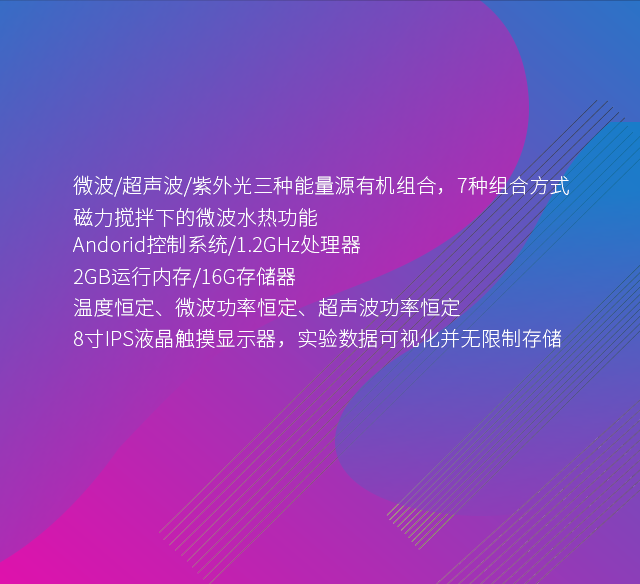 | 微波超聲波協(xié)同控制 | 溫度恒定模式下,微波功率和超聲波占空比會隨溫度自動調(diào)節(jié)以保溫度穩(wěn)定,控溫波動≤±2℃ |
