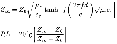 其中RL是以dB為單位的反射功率與入射功率的比值,f、d和c分別是電磁波在自由空間中的頻率、厚度和速度。Z?和Zin分別代表自由空間和吸收體的輸入阻抗。因此,一旦知道了μr和εr,就可以在指定厚度下評(píng)估RL值與頻率的關(guān)系。