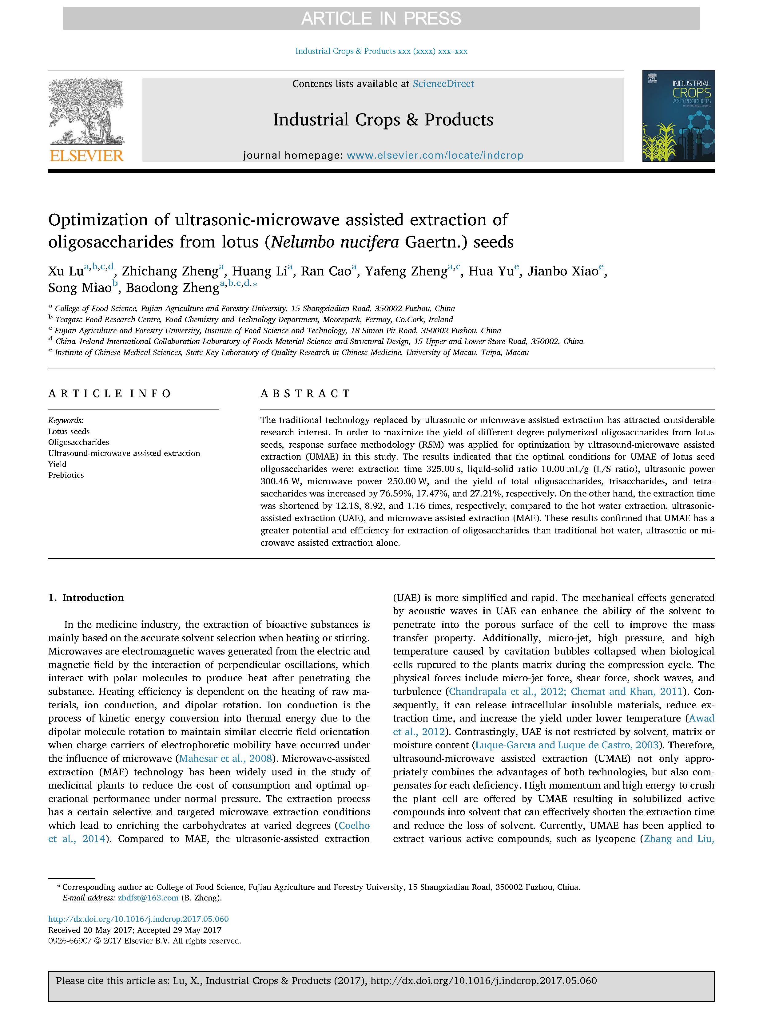 這篇由福建農(nóng)林大學(xué)食品科學(xué)學(xué)院等的研究學(xué)者完成,討論超聲波 - 微波輔助提取蓮子(Nelumbo nucifera Gaertn.)種子寡糖的優(yōu)化的論文,發(fā)表在一區(qū)重要期刊《Industrial Crops and Products 》,影響因子:3.849。
