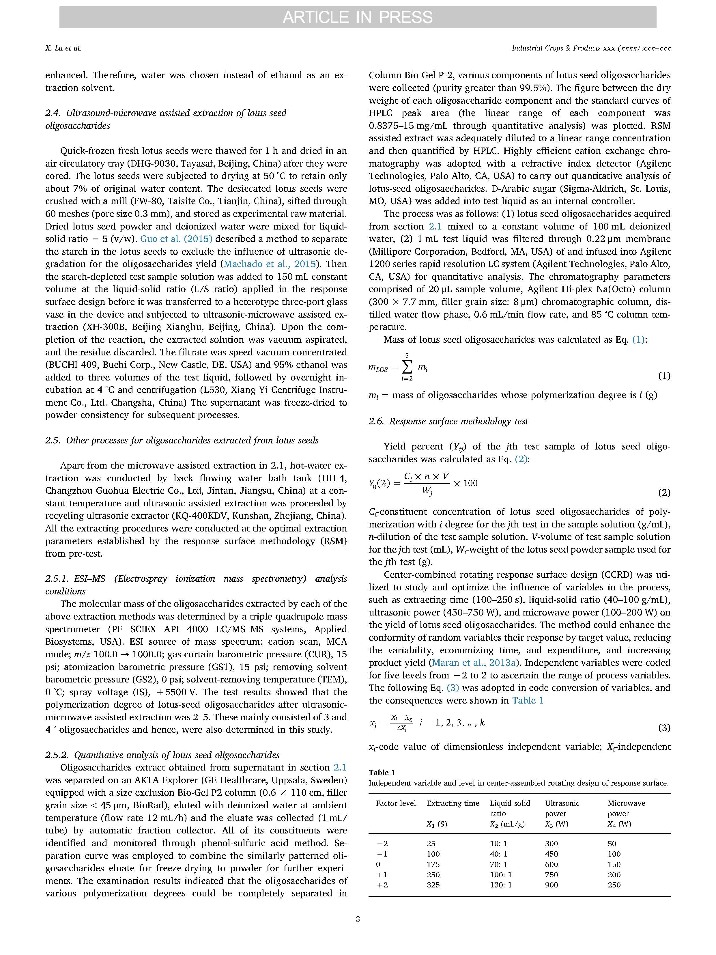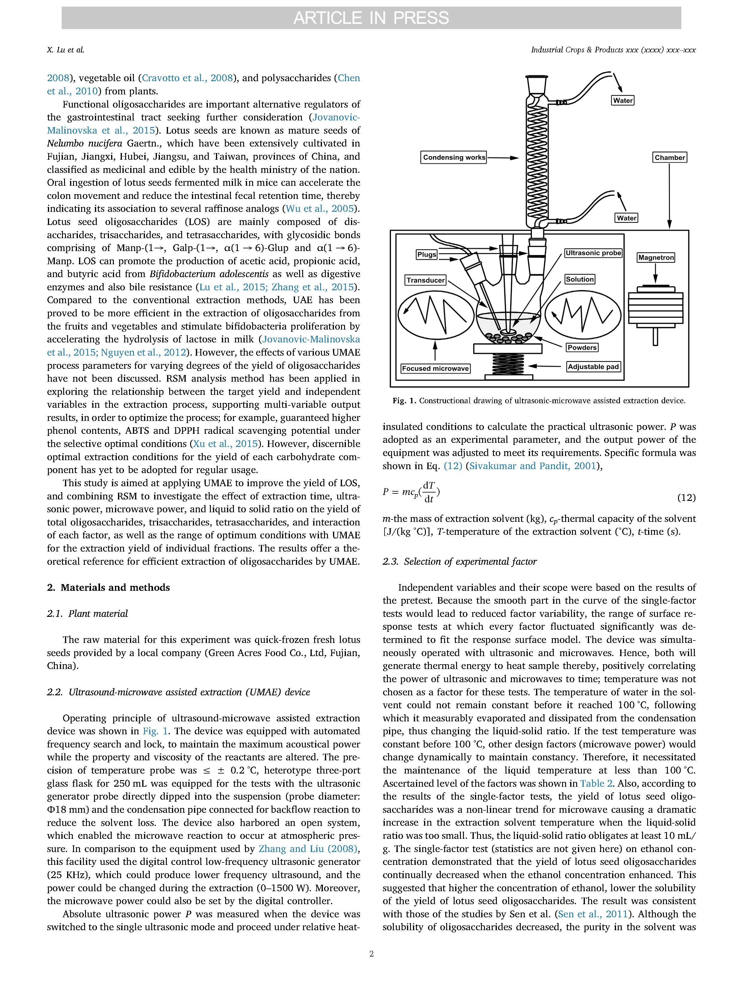 傳統(tǒng)的超聲或微波輔助萃取技術(shù)已經(jīng)引起了廣泛的研究興趣。為了最大限度地提高蓮子中不同程度聚合低聚糖的收率,本研究采用響應(yīng)面法(RSM)進(jìn)行超聲-微波輔助萃取(UMAE)優(yōu)化。
