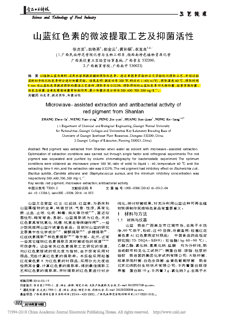 這篇由廣西民族師范學(xué)院化學(xué)與生物工程系的研究學(xué)者完成,討論山藍(lán)紅色素的微波提取工藝及抑菌活性的論文,發(fā)表在重要期刊《食品工業(yè)科技》上。