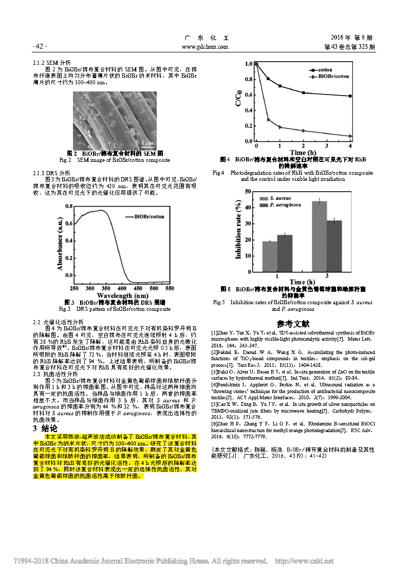 文章采用一種簡單、省時的微波-超聲波法制備了BiOBr/棉布復(fù)合材料,通過X-射線粉末衍射(XRD),掃描電子顯微鏡(SEM)和紫外可見漫反射光譜儀(DRS)對其進(jìn)行了表征。實驗結(jié)果表明,BiOBr/棉布復(fù)合材料在可見光下對有機(jī)染料羅丹明 B 表現(xiàn)出良好的光催化活性,同時所制備的復(fù)合材料對金黃色葡萄球菌和綠膿桿菌均表現(xiàn)出一定的抗菌活性。