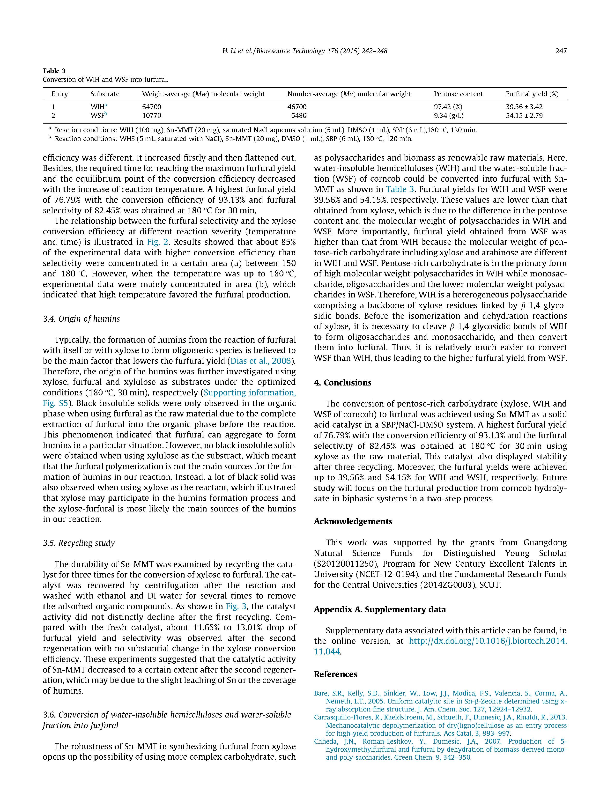此外,Sn-MMT還表明,在SBP/NaCl-DMSO體系中,WIH和WSF分別能直接獲得39.56%和54.15%的糠醛產(chǎn)率。