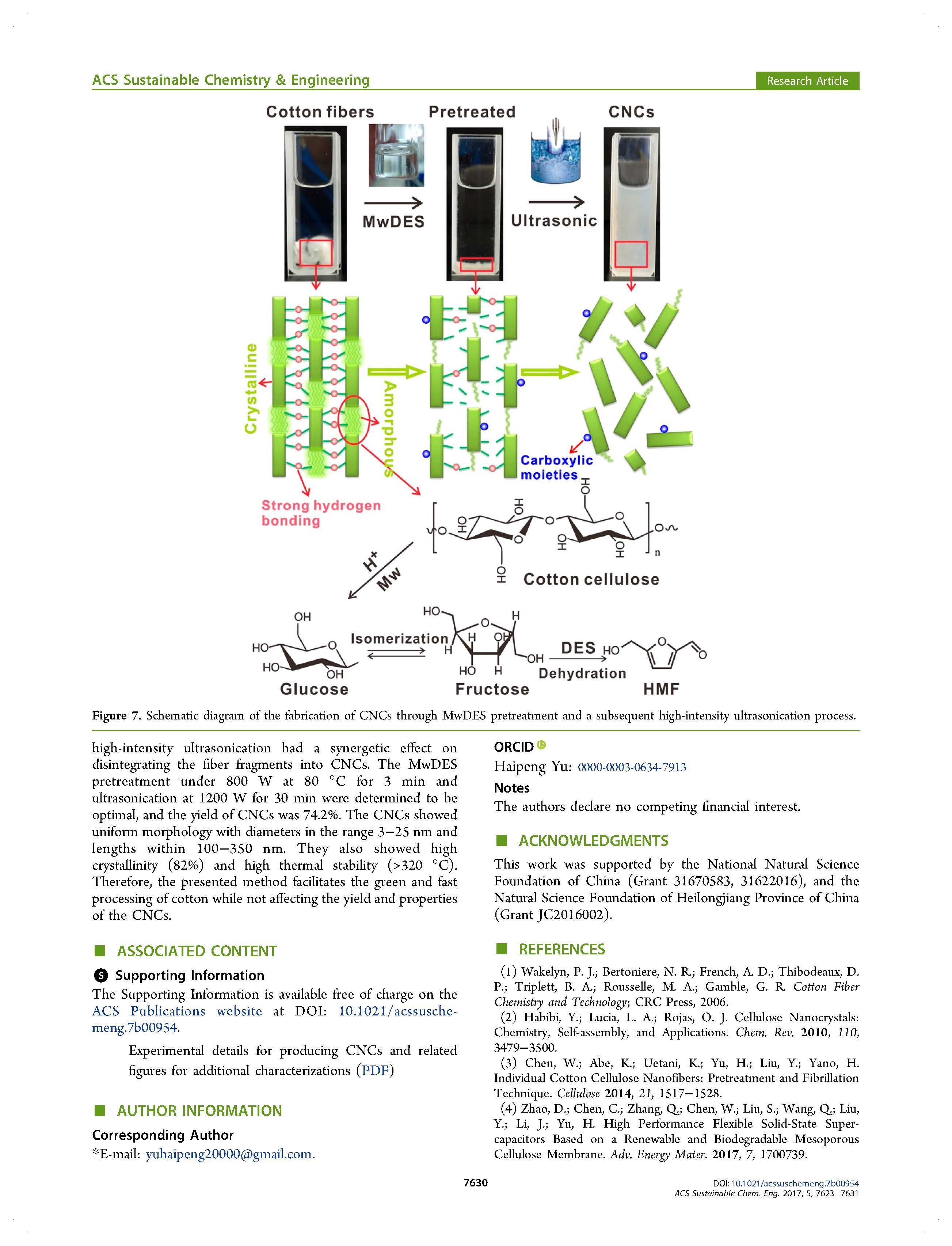 這篇由西安交通大學(xué)等的研究學(xué)者完成,討論通過(guò)深低共熔溶劑高效裂解棉中的強(qiáng)氫鍵并高效地制備纖維素納米晶的論文,發(fā)表在二區(qū)重要期刊《ACS Sustainable Chemistry & Engineering》,影響因子:6.140。