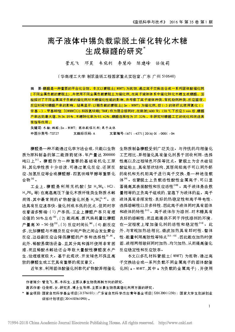 這篇由華南理工大學(xué)的研究學(xué)者完成,討論離子液體中錫負(fù)載蒙脫土催化轉(zhuǎn)化木糖生成糠醛的研究的論文,發(fā)表在重要期刊《造紙科學(xué)與技術(shù)》上。