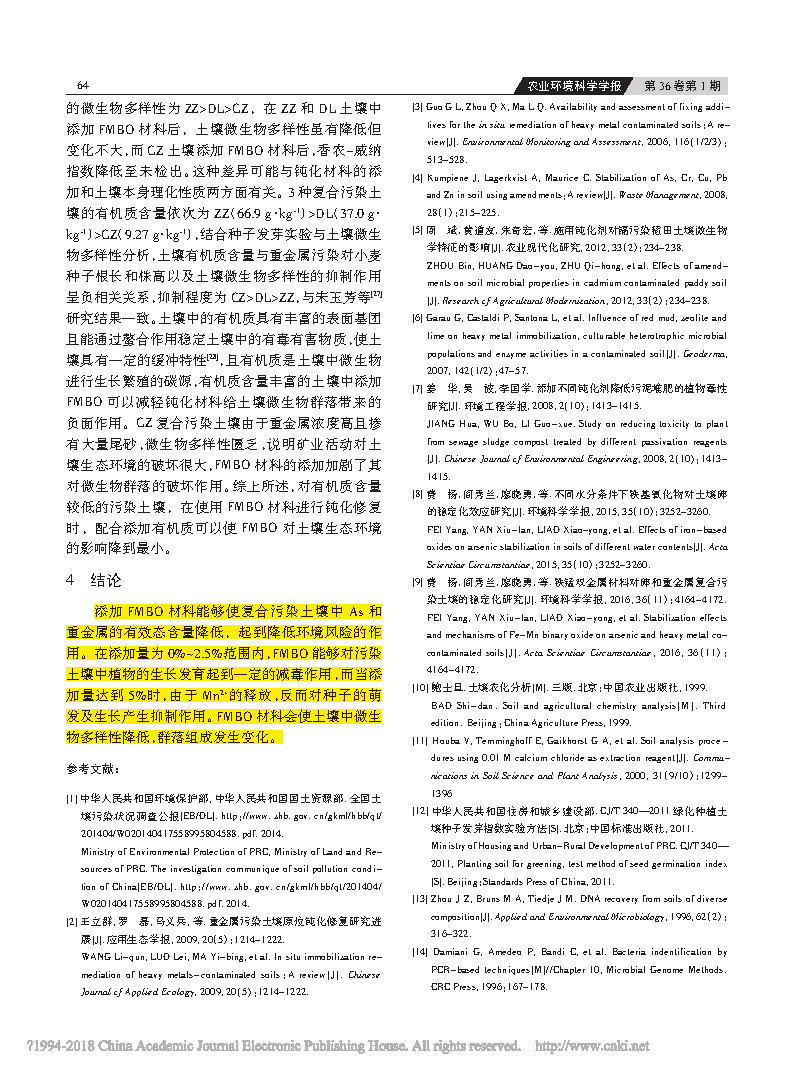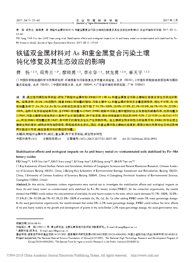 這篇由中國(guó)科學(xué)院地理科學(xué)與資源研究所的研究學(xué)者完成,討論鐵錳雙金屬材料對(duì)As和重金屬?gòu)?fù)合污染土壤鈍化修復(fù)及其生態(tài)效應(yīng)的影響的論文,發(fā)表在重要期刊《農(nóng)業(yè)環(huán)境科學(xué)學(xué)報(bào)》上。