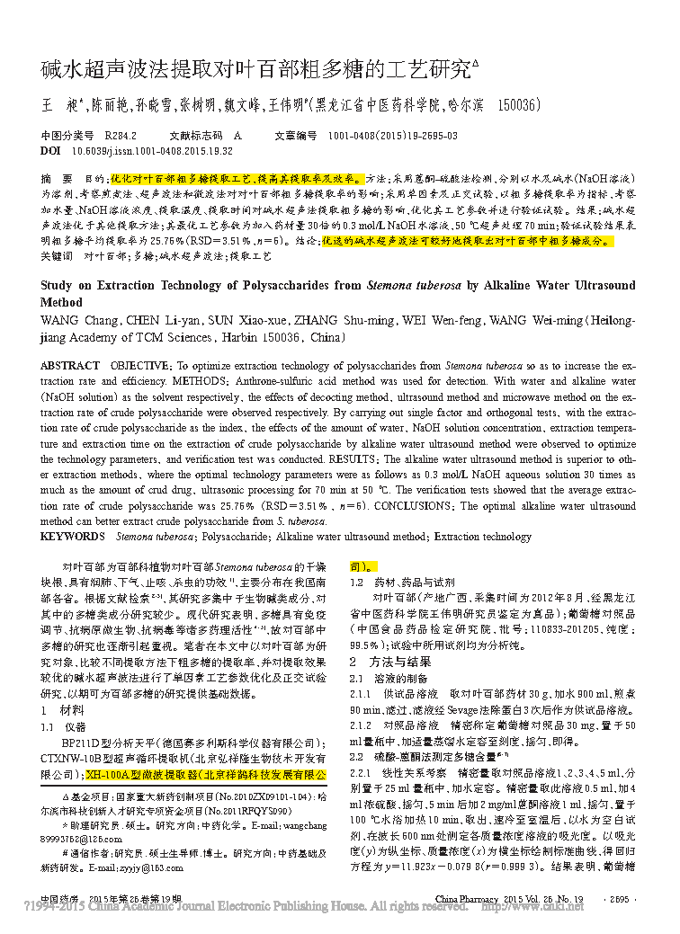 這篇由黑龍江省中醫(yī)藥科學(xué)院的研究學(xué)者完成,討論堿水超聲波法提取對葉百部粗多糖的工藝研究的論文,發(fā)表在重要期刊《中國藥房》上。