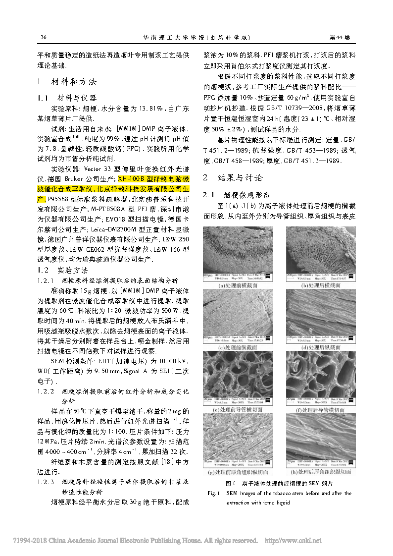 100B 堿性離子液體提取后煙梗纖維形態(tài)及抄造性能的變化