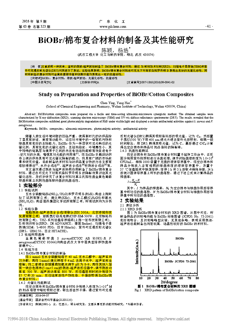 這篇由武漢工程大學(xué)化工與制藥學(xué)院的研究學(xué)者完成,討論BiOBr/棉布復(fù)合材料的制備及其性能研究的論文,發(fā)表在重要期刊《廣東化工》上。