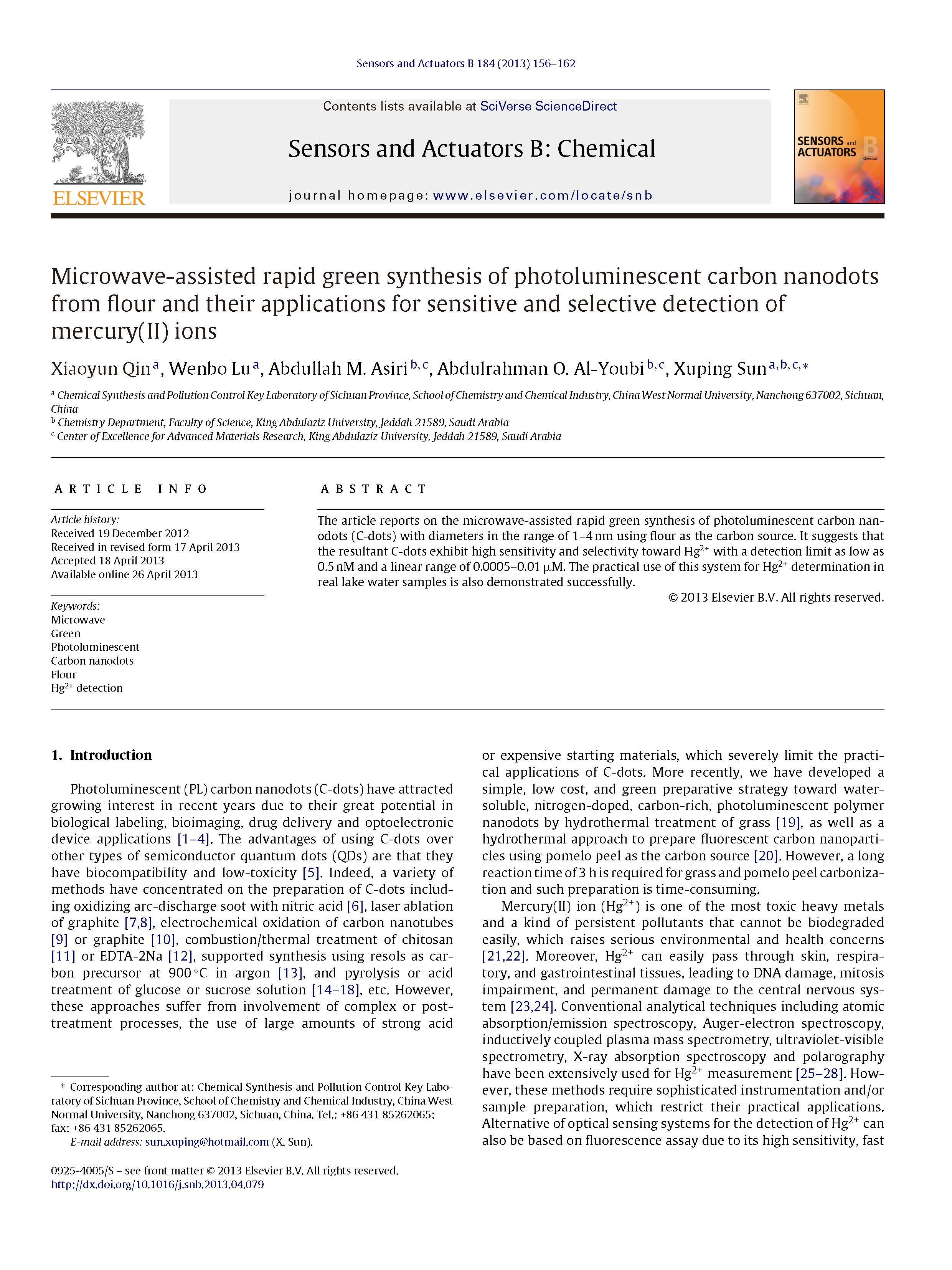 這篇由四川省化學合成與污染控制重點實驗室等的研究學者完成,討論微波輔助快速綠色合成面粉中的光致發(fā)光碳納米點及其在汞(II)離子敏感和選擇性檢測中的應用的論文,發(fā)表在一區(qū)重要期刊《Sensors and Actuators B: Chemical》,影響因子:5.667。