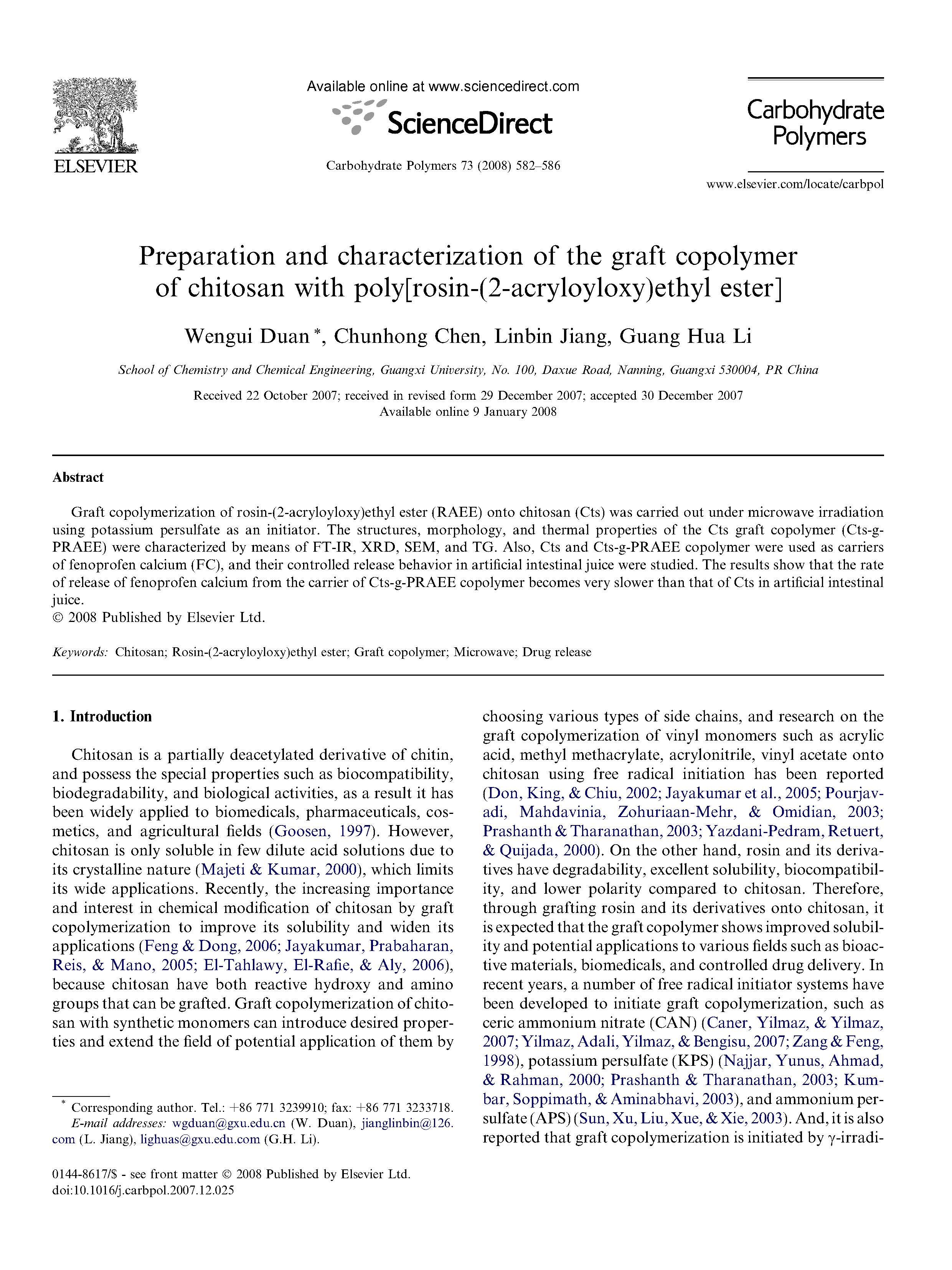 這篇由廣西大學(xué)等的研究學(xué)者完成,討論殼聚糖與聚[松香 - (2-丙烯酰氧基)乙酯]接枝共聚物的制備與表征的論文,發(fā)表在二區(qū)重要期刊《Carbohydrate Polymers》,影響因子:5.158。