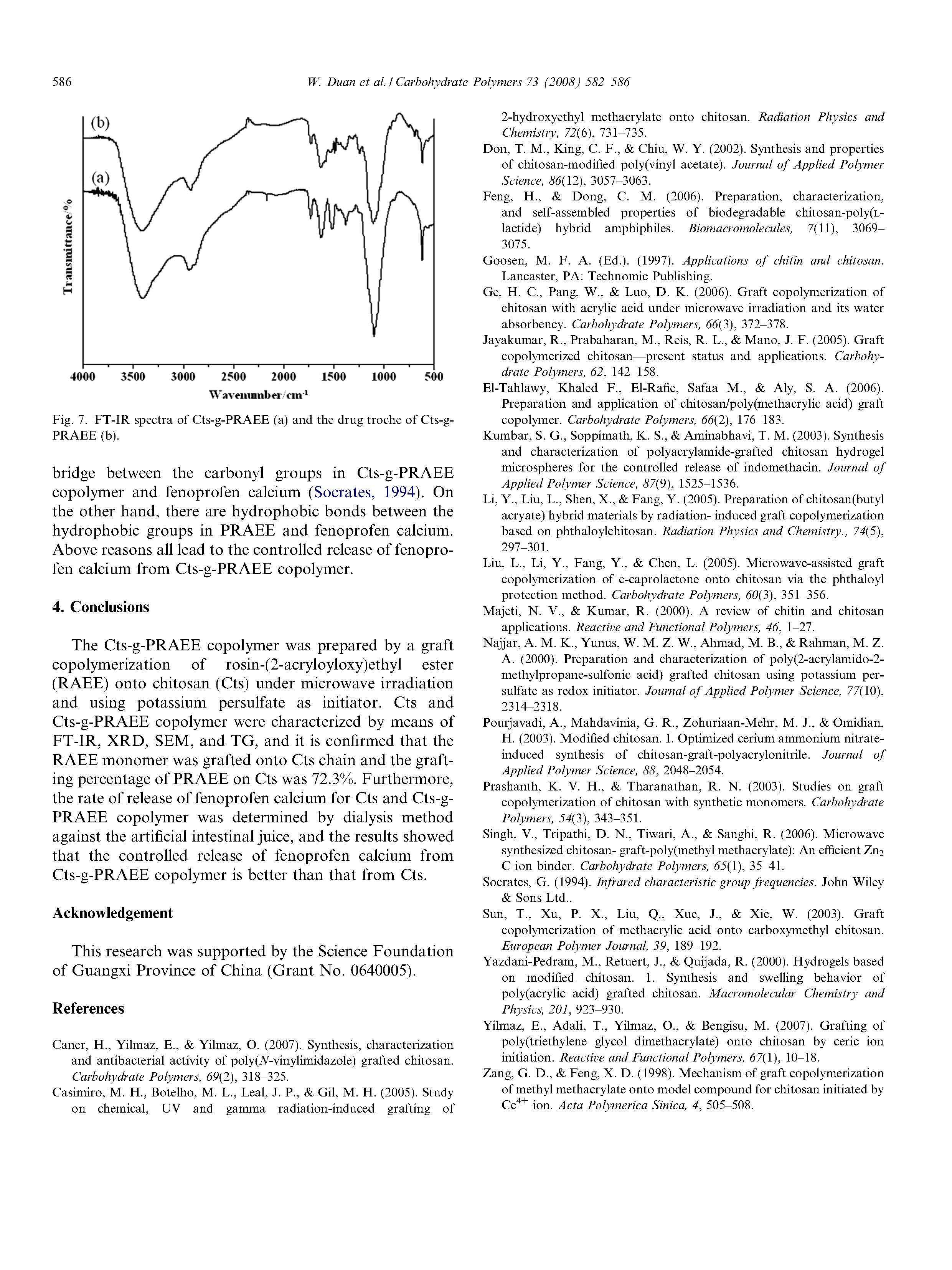 通過移植物制備CTS-G-PRAEE共聚物,松香-(2-丙烯酸酯氧基)乙酯共聚微波輻射下殼聚糖(CTS)的研究和使用過硫酸鉀作為引發(fā)劑。CTS和CTS-G-PRAEE共聚物的特征在于:FT-IR、XRD、SEM和TG證實了將RAEE單體接枝到CTS鏈上,在CTS上接枝率為72.3%。此外,通過透析方法測定非諾洛芬鈣對CTS和CTS-GPARAEE共聚物的釋放速率對人工腸液進行了對照研究非諾洛芬鈣的控釋CTS-G-PRAEE共聚物優(yōu)于CTS。