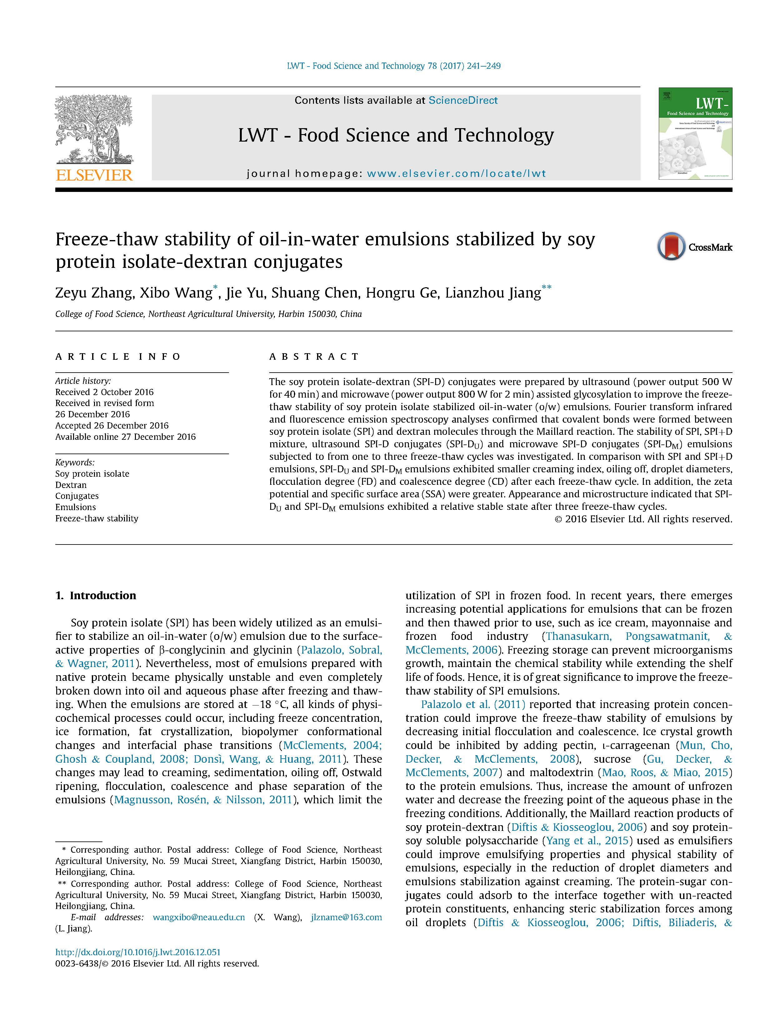 這篇由東北農(nóng)業(yè)大學(xué)等的研究學(xué)者完成,討論通過大豆蛋白分離物 - 葡聚糖綴合物穩(wěn)定的水包油乳液的凍融穩(wěn)定性的論文,發(fā)表在二區(qū)重要期刊《LWT - Food Science and Technology》,影響因子:3.129。