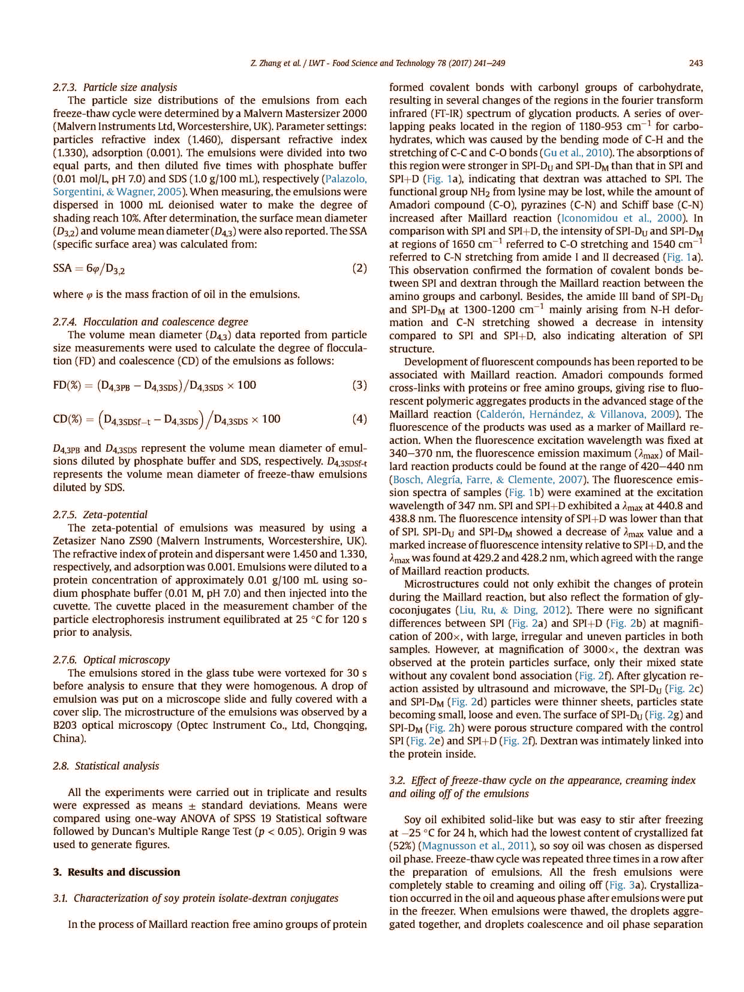 通過超聲(功率輸出500W)制備大豆蛋白分離-葡聚糖(SPI-D)綴合物,40分鐘)和微波(功率輸出800W用于2分鐘)輔助糖基化以改善大豆蛋白分離穩(wěn)定的油包水(O/W)乳液的冷凍穩(wěn)定性。傅里葉變換紅外和熒光發(fā)射光譜分析證實(shí)了形成共價(jià)鍵,通過Maillard反應(yīng)分離大豆蛋白分離物(SPI)和葡聚糖分子。 SPI的穩(wěn)定性,SPILETD混合物、超聲SPI-D綴合物(SPI-DU)和微波SPI-D綴合物(SPI-DM)乳液對(duì)1-3個(gè)凍融循環(huán)進(jìn)行了研究。與SPI和SPIO比較乳液、SPI-DU和SPI-DM乳液表現(xiàn)出較小的乳油化指數(shù)、油脫油、液滴直徑每次凍融循環(huán)后的絮凝程度(FD)和聚結(jié)度(CD)。 此外,Zeta電位和比表面積(SSA)更大。外觀和微觀結(jié)構(gòu)表明,在三個(gè)凍融循環(huán)后,SPIDU和SPI-DM乳液表現(xiàn)出相對(duì)穩(wěn)定的狀態(tài)。