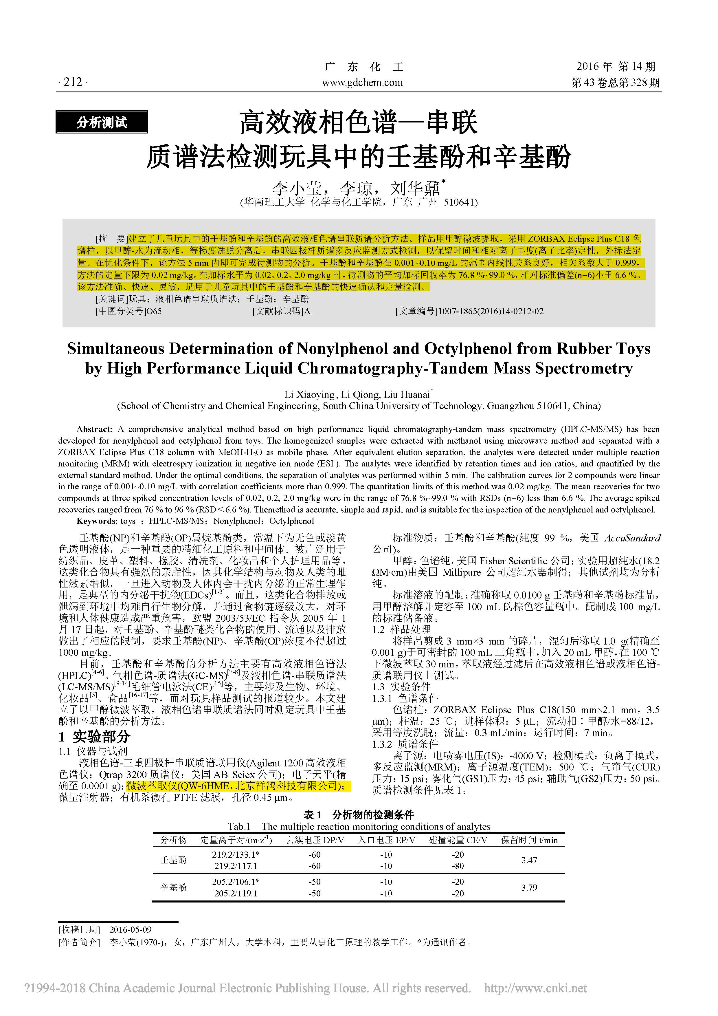 這篇由華南理工大學化學與化工學院的研究學者完成,討論高效液相色譜—串聯(lián)質(zhì)譜法檢測玩具中的壬基酚和辛基酚的論文,發(fā)表在重要期刊《廣東化工》上。