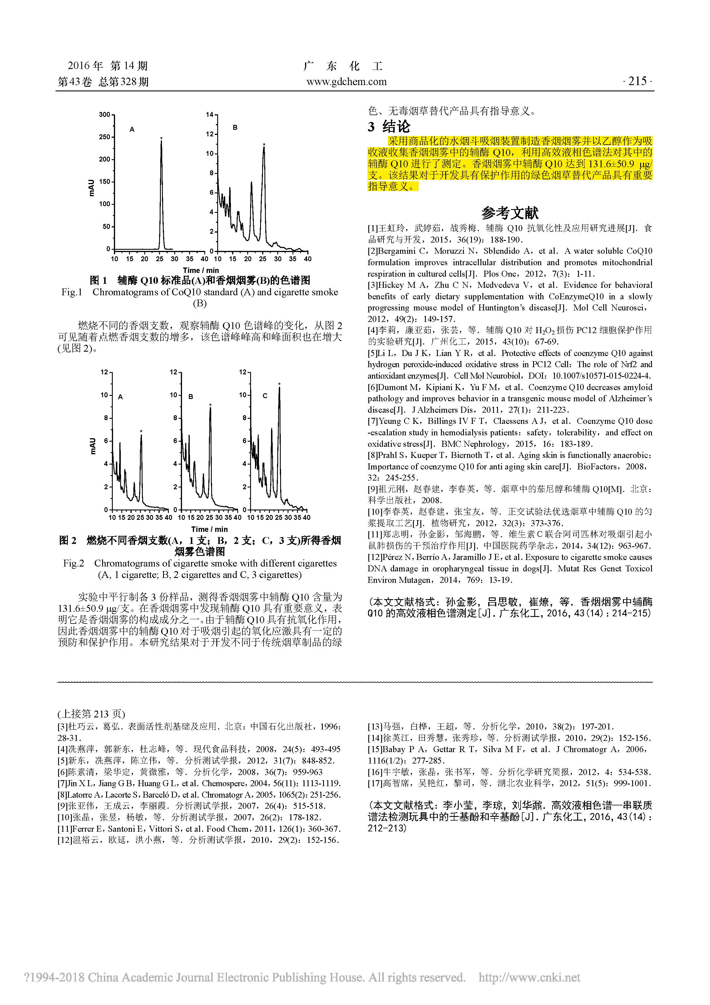 采用商品化的水煙斗吸煙裝置制造香煙煙霧并以乙醇作為吸 收液收集香煙煙霧中的輔酶Q10,利用高效液相色譜法對其中的 輔酶Q10 進行了測定。香煙煙霧中輔酶Q10 達到131.6?50.9 μg 支。該結(jié)果對于開發(fā)具有保護作用的綠色煙草替代產(chǎn)品具有重要 指導意義。
