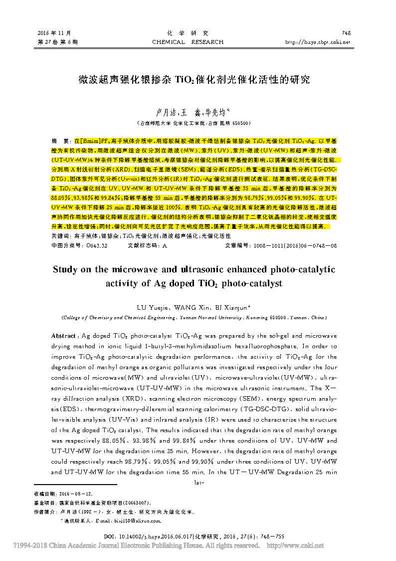 在[Bmim]PF6離子液體介質(zhì)中,用 溶膠凝膠-微 波 干 燥 法 制 備 銀 摻 雜 TiO2光 催化劑 TiO2-Ag.以 甲基 橙為有機污染物,用 微 波 超 聲 組 合 儀 分 別 在 微 波(MW)、紫 外(UV)、紫 外-微 波(UV-MW)和超 聲-紫 外-微 波 (UT-UV-MW)4種條件下降解甲基橙溶液,考察銀摻雜對催化劑降解甲基橙的影響,以提高催化劑光催化性能. 分別用 X射線衍射分析(XRD)、掃 描 電 子 顯 微 鏡(SEM)、能 譜分析(EDS)、熱 重-差 示 掃 描 量 熱 分 析(TG-DSC- DTG)、固體紫外可見分析(Uv-vis)和紅外分析(IR)對 TiO2-Ag催化劑進行測試表征.結(jié)果表明,優(yōu)化條件下制 備 TiO2-Ag催化劑在 UV、UV-MW 和 UT-UV-MW 條 件 下 降 解 甲 基 橙 35 min后,甲 基 橙 的 降 解 率 分 別 為 88.05%、93.98%和99.84%;降解甲基橙55min后,甲基橙的降解率分別為98.79%、99.05%和99.90%.在 UT- UV-MW 條件下降解25min后,降解率接近100%.表 明 TiO2-Ag催 化 劑 具 有 較 高 的 光 催 化 降 解 活 性,微 波超 聲協(xié)同作用加快光催化降解反應(yīng)進行.催化劑的結(jié)構(gòu)分析表明,銀摻雜抑制了二氧化鈦晶相的轉(zhuǎn)變,使相變溫度 升高,穩(wěn)定性增強;同時,催化劑向可見光區(qū)擴寬了光響應(yīng)范圍,提高了量子效率,從而光催化性能得以提高.